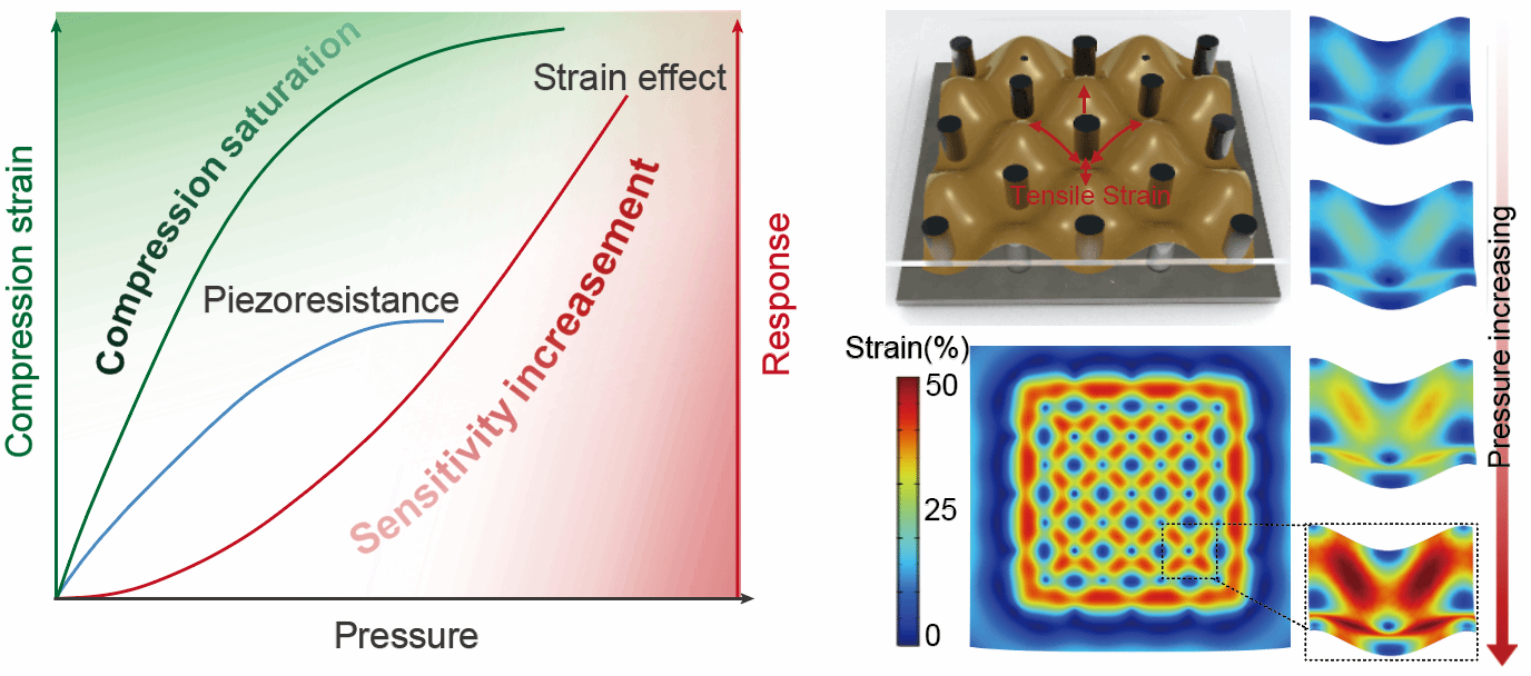 针对现有挑战,西北工业大学黄维院士团队王学文教授课题组提出了基于应变效应的新型压力传感器,通过调整柔性超薄导电薄膜和应变诱导微结构的尺寸和模量差异,实现了超宽压力检测范围内灵敏度的正向增长。该传感器在45 Pa至4.1 MPa的压力范围内表现出稳定的正电阻响应;同时,区别于经典压阻效应结构,传感器的灵敏度随压力增大由5.22 MPa-1增长至70 MPa-1。这一成果打破了柔性压力传感器在高灵敏度和广泛压力检测范围之间的制约关系,实现了灵敏度和压力检测范围的协同提升,为宽压域柔性传感器设计提供了新的思路。