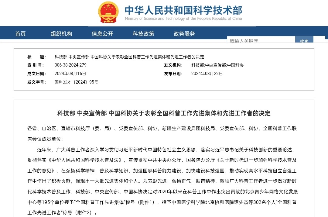 全国科普工作先进集体和先进工作者由科技部、中央宣传部、中国科协联合组织评选,旨在落实习近平总书记关于科技创新的重要论述,贯彻落实《中华人民共和国科学技术普及法》,宣传贯彻中共中央办公厅、国务院办公厅《关于新时代进一步加强科学技术普及工作的意见》,表彰先进,弘扬正气,振奋精神,激励广大科普工作者进一步做好新时代科学技术普及工作。