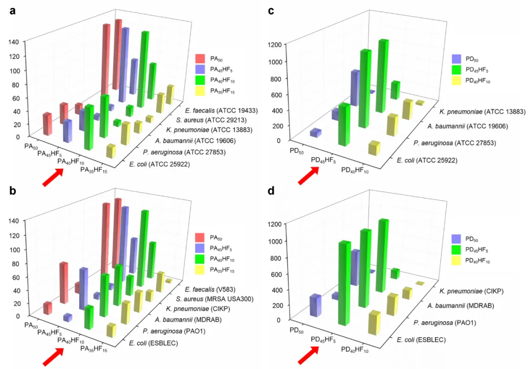 图2:PAmHFn和PDmHFn的细胞选择性。a-b: PAmHFn对于实验室标准和临床耐药ESAKPE病原体的细胞选择性;c-d: PDmHFn对于实验室标准和临床耐药革兰氏阴性ESAKPE病原体的细胞选择性。