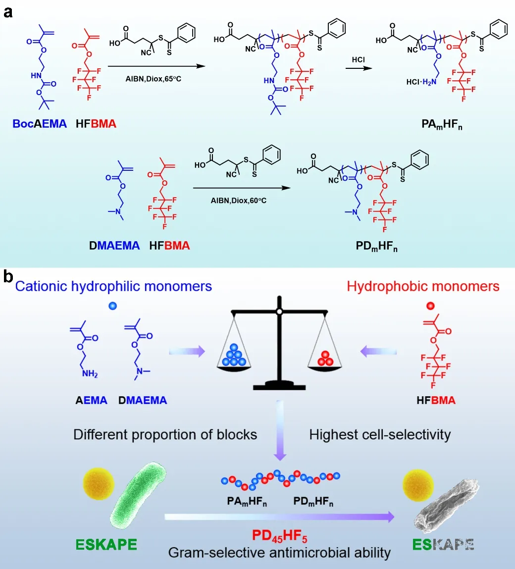 西北工业大学柔性电子研究院黄维院士李鹏教授课题组长期聚焦于应对耐药菌感染的生物材料与柔性器件研究,近期该课题组合成了一类新型含氟两亲性阳离子聚合物,其能够选择性地杀灭多重耐药的革兰氏阴性ESKAPE病原体,同时延缓耐药性的产生。受具有阳离子两亲性结构的天然抗菌肽启发,该课题组利用可逆加成-断裂链转移聚合技术(RAFT)合成了一系列含氟两亲性阳离子聚合物,通过可控聚合调控阳离子单体(2-氨基乙基甲基丙烯酸酯盐酸盐,AEMA;2-(二甲氨基)乙基甲基丙烯酸酯,DMAEMA)和疏水单体(2,2,3,3,4,4,4-七氟丁基甲基丙烯酸酯,HFBMA)之间的配比,优化分子生物活性(图1)。相比传统的疏水烷基,含氟基团具有更优的疏水、疏油以及生物相容性,可提升阳离子聚合物的抗菌活性并降低溶血性。这项研究表明,PAmHFn系列聚合物具有广谱抗菌性能,而PDmHFn系列聚合物则具有针对革兰氏阴性菌的选择杀菌性,可有效杀灭多种革兰氏阴性ESKAPE耐药菌株,同时具有良好的哺乳动物细胞相容性和低溶血性,为革兰氏阴性菌感染的治疗药物研发提供了一种新的研究思路。