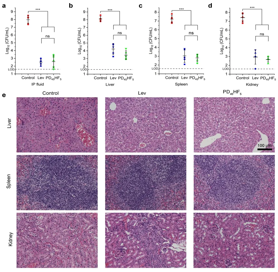 图5:体内腹膜炎感染模型。a-d:腹腔积液、肝、脾、肾中细菌计数;e:不同材料处理后腹部器官的苏木精-伊红染色染色图像。