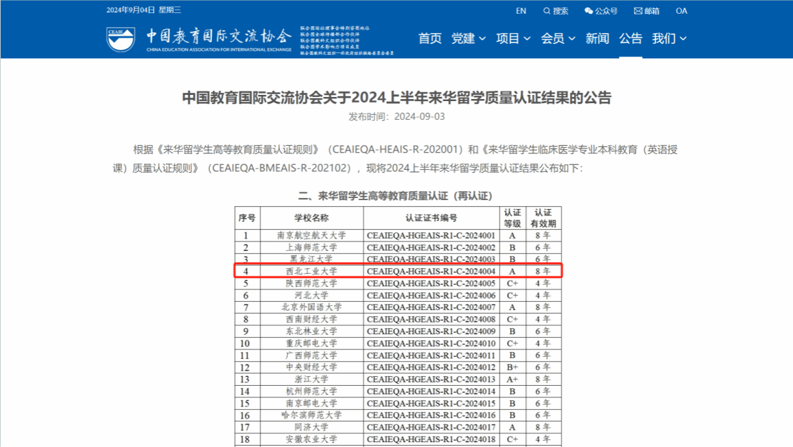 9月3日,中国教育国际交流协会发布关于2024上半年来华留学质量认证结果的公告。鸭脖官网顺利通过来华留学生高等教育质量认证(再认证),获得认证最高等级“A级”,认证有效期为8年,也是西部首家获评A级高校。