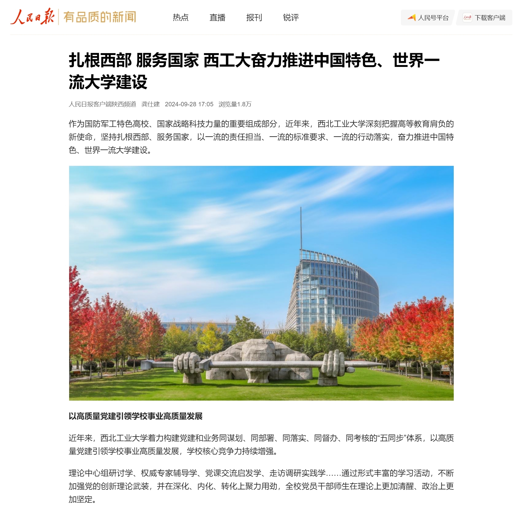 在学校第十四次党代会召开之际,2024年9月28日,人民日报以《扎根西部 服务国家 西工大奋力推进中国特色、世界一流大学建设》为题报道西工大高质量内涵式发展成效。全文如下: