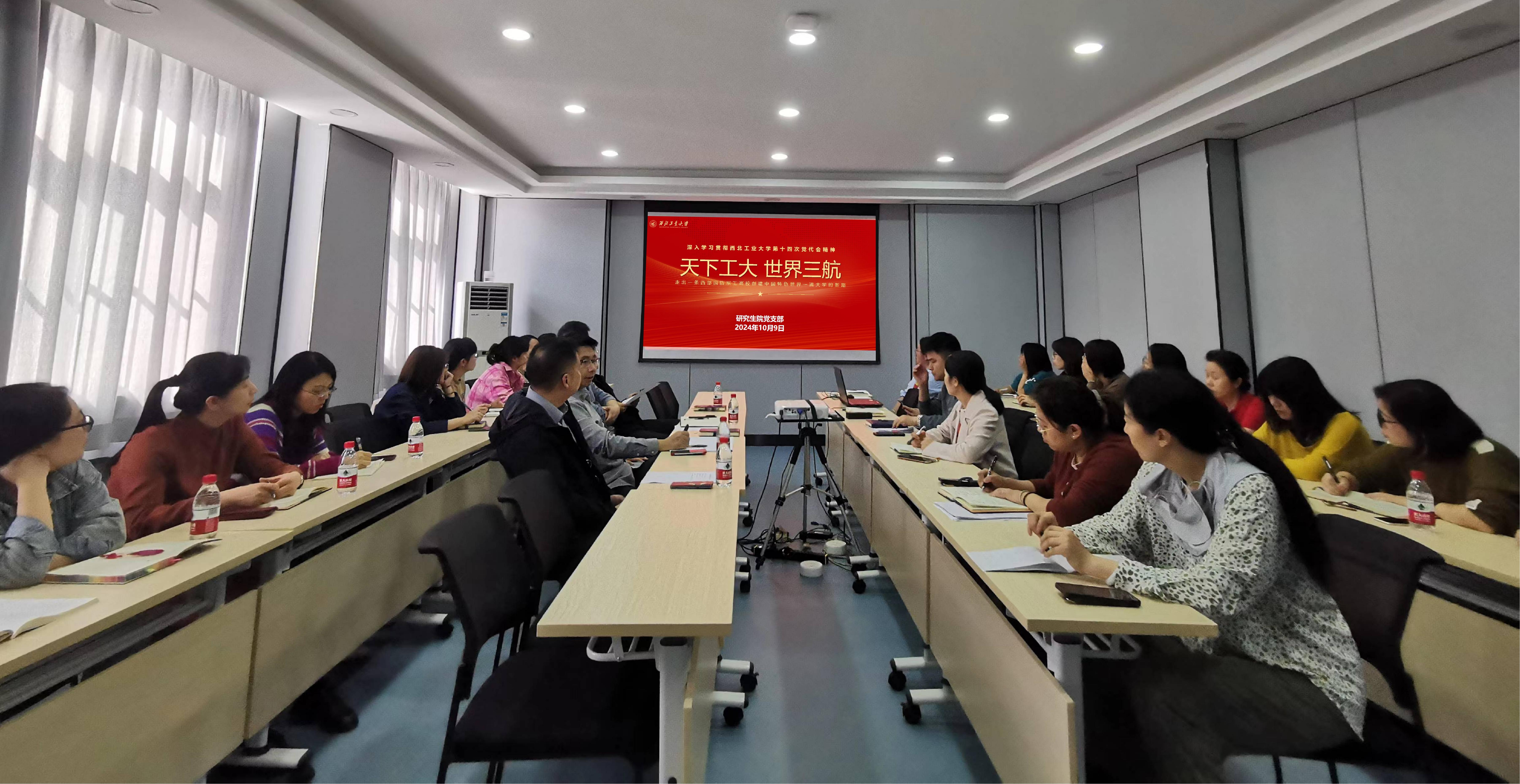 会议强调,研究生院全体同志要深入学习领会、全面贯彻落实,切实把思想和行动统一到落实学校第十四次党代会的重大决策部署上来,锚定“127”发展目标和“天下工大、世界三航”远景目标,充分发挥研究生教育是教育、科技、人才的重要交汇点作用,聚焦强化使命引领、创新育人模式、拓展育人资源、提升研究生招生竞争力,不断推进研究生教育体制机制改革,进一步提升研究生培养质量,大力推进“总师型”拔尖创新人才自主培养,为奋力谱写中国特色世界一流大学建设新篇章贡献力量。
