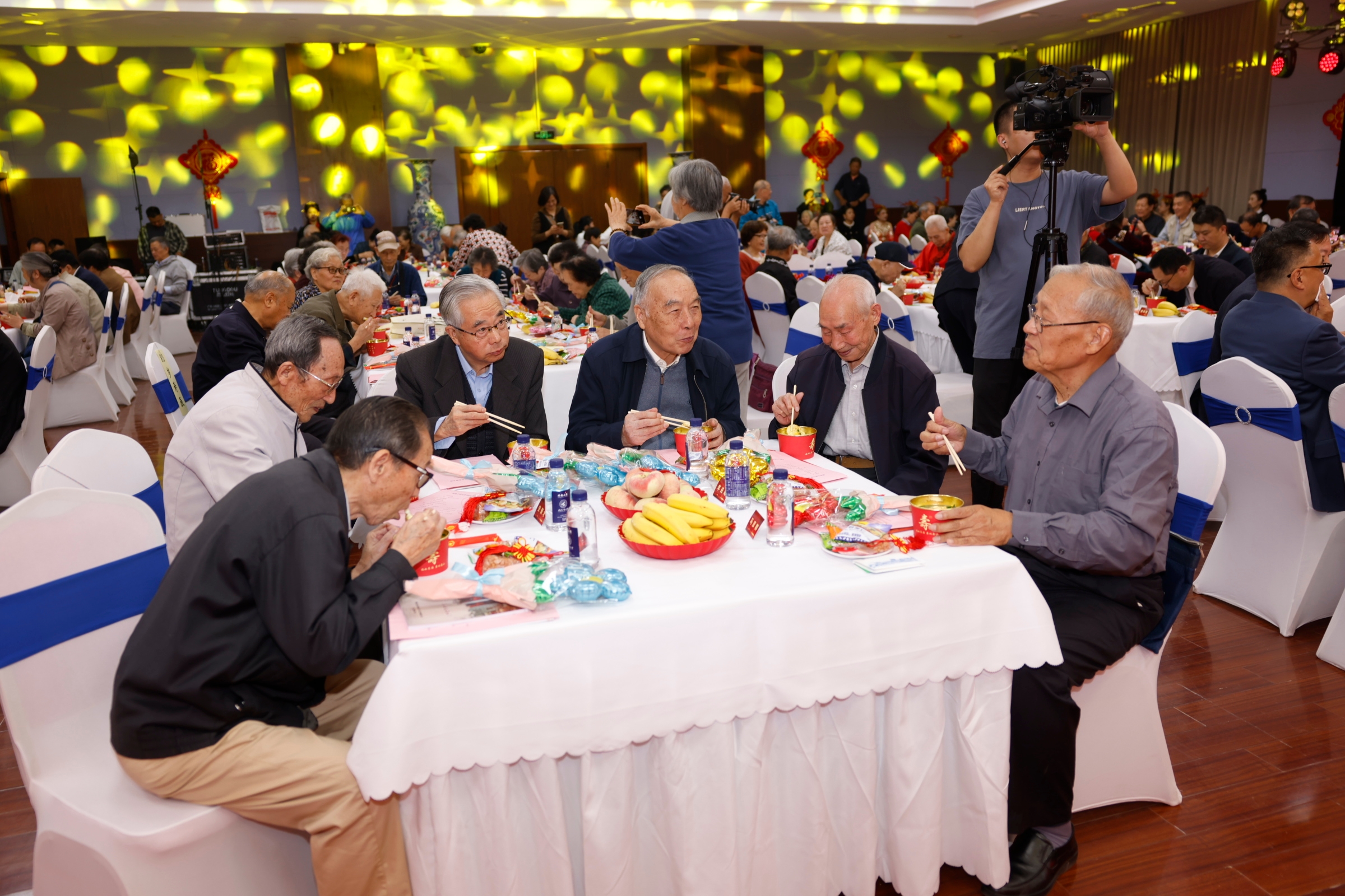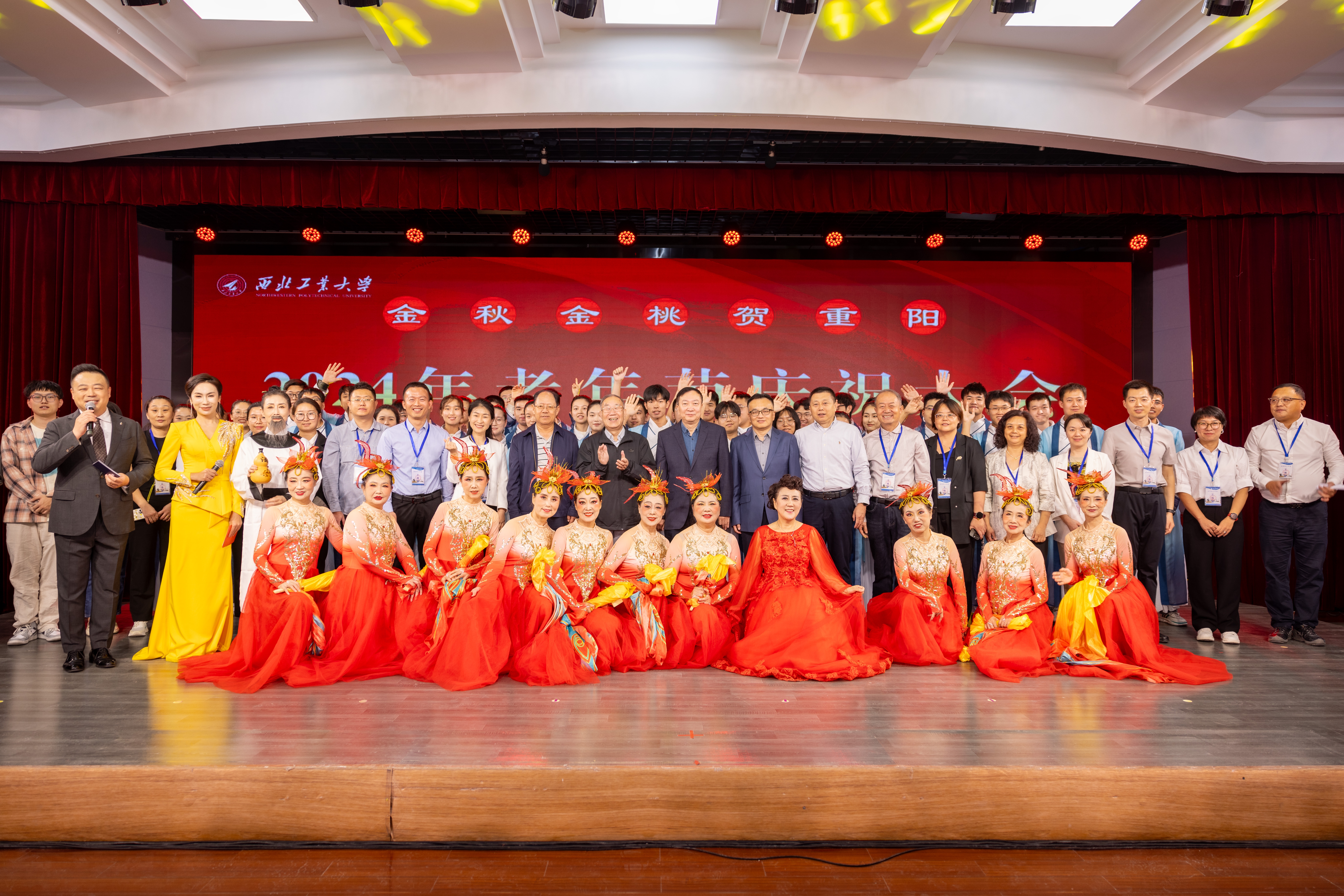 一碗长寿面,承载着千年来尊老爱老的温情与祝福。由陕西民俗文化艺术团带来的表演《欢乐礼面行》生动有趣,42名学生身着传统服饰为现场的长者端上爱心暖暖的长寿面。热气腾腾的长寿面凝聚着全校师生的美好祝愿,整个会场欢声笑语、喜气祥和。