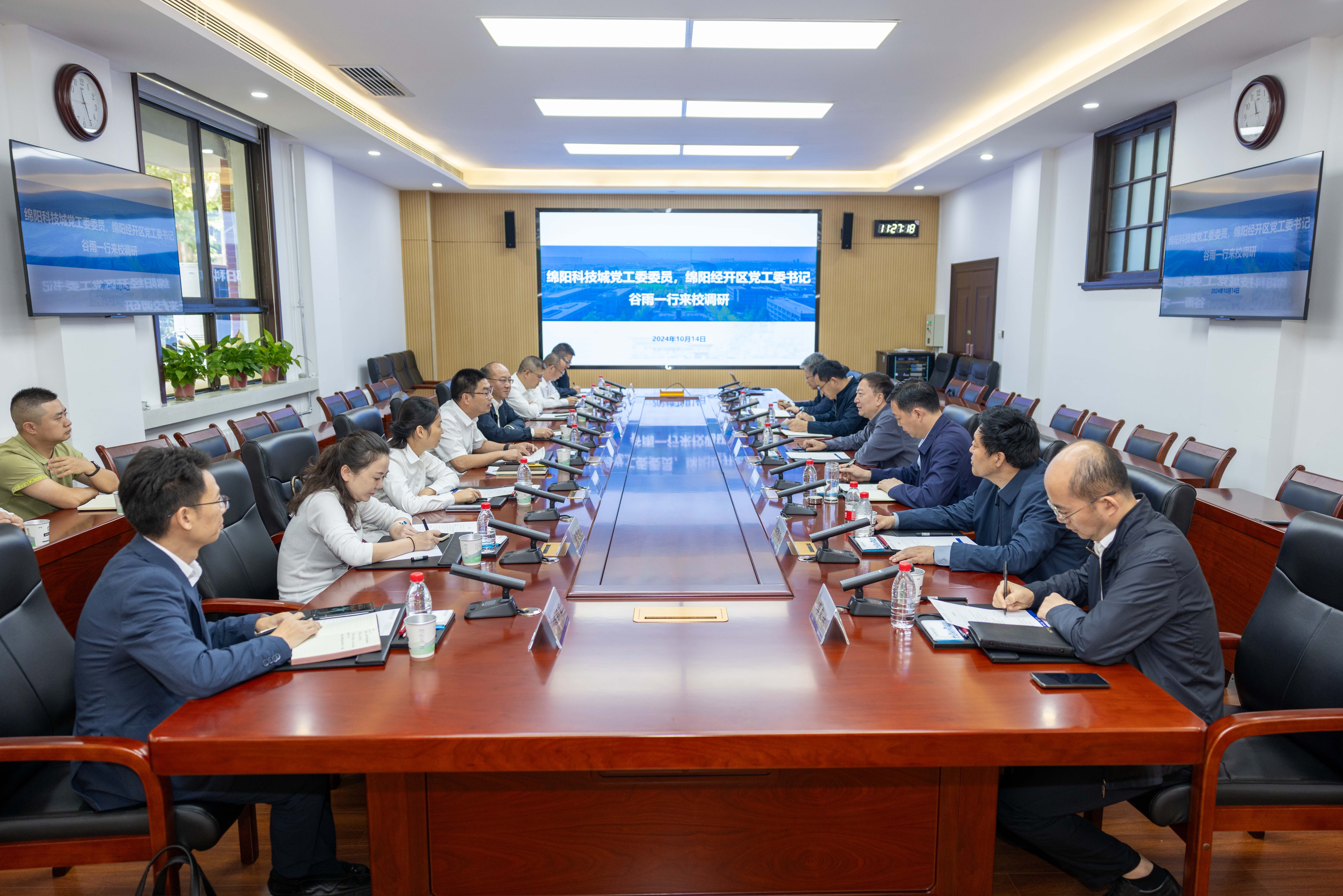 10月14日上午,绵阳科技城党工委委员、绵阳经开区党工委书记谷雨,区党工委副书记、管委会副主任谢文伟一行来校调研。鸭脖官网党委书记李言荣会见谷雨一行。副校长张开富参加会见。