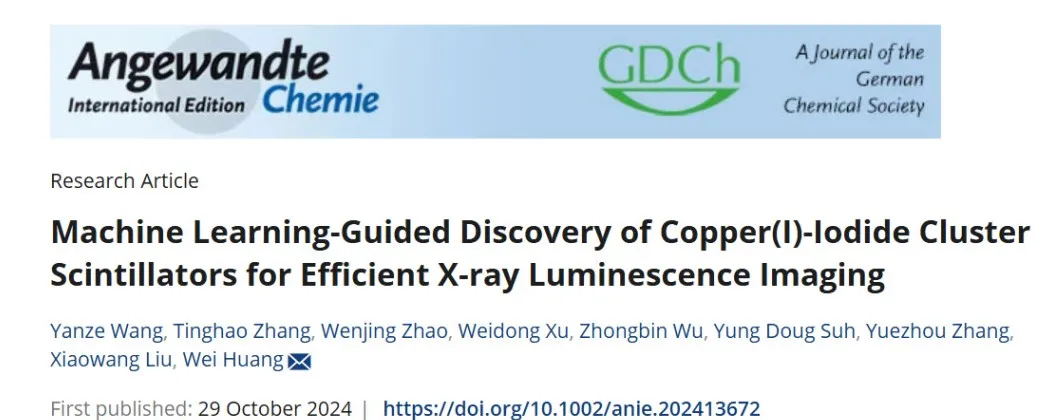 近日,西北工业大学柔性电子研究院黄维院士团队刘小网教授课题组和张悦周副教授课题组合作,基于自建的铜碘团簇基闪烁体数据集,开发出一种用于预测铜碘团簇材料闪烁性能的机器学习模型,模型的决定系数可以达到0.88。利用这种机器学习模型,我们获得了一种高性能的铜碘团簇基闪烁体,即碘化铜-(1-丁基-1,4-二氮杂双环[2.2.2] 辛烷-1-鎓)2(Cu6I8(bu-ted)2)。实验结果表明,制备的 Cu6I8(bu-ted)2闪烁体的辐射发光强度比PbWO4强56倍,使X射线的检测限达到19.6 nGyairs−1。此外,我们通过将这些闪烁体作为微填料加入到用于X射线成像的柔性复合闪烁体的制造中,展示了这些闪烁体的多功能性。柔性复合闪烁体实现了20 lp mm−1的静态分辨率,并在动态X射线成像中表现出良好的性能。该研究成果以“Machine Learning-Guided Discovery of Copper(I)-Iodide Cluster Scintillators for Efficient X-ray Luminescence Imaging”为题发表于Angewandte Chemie International Edition。