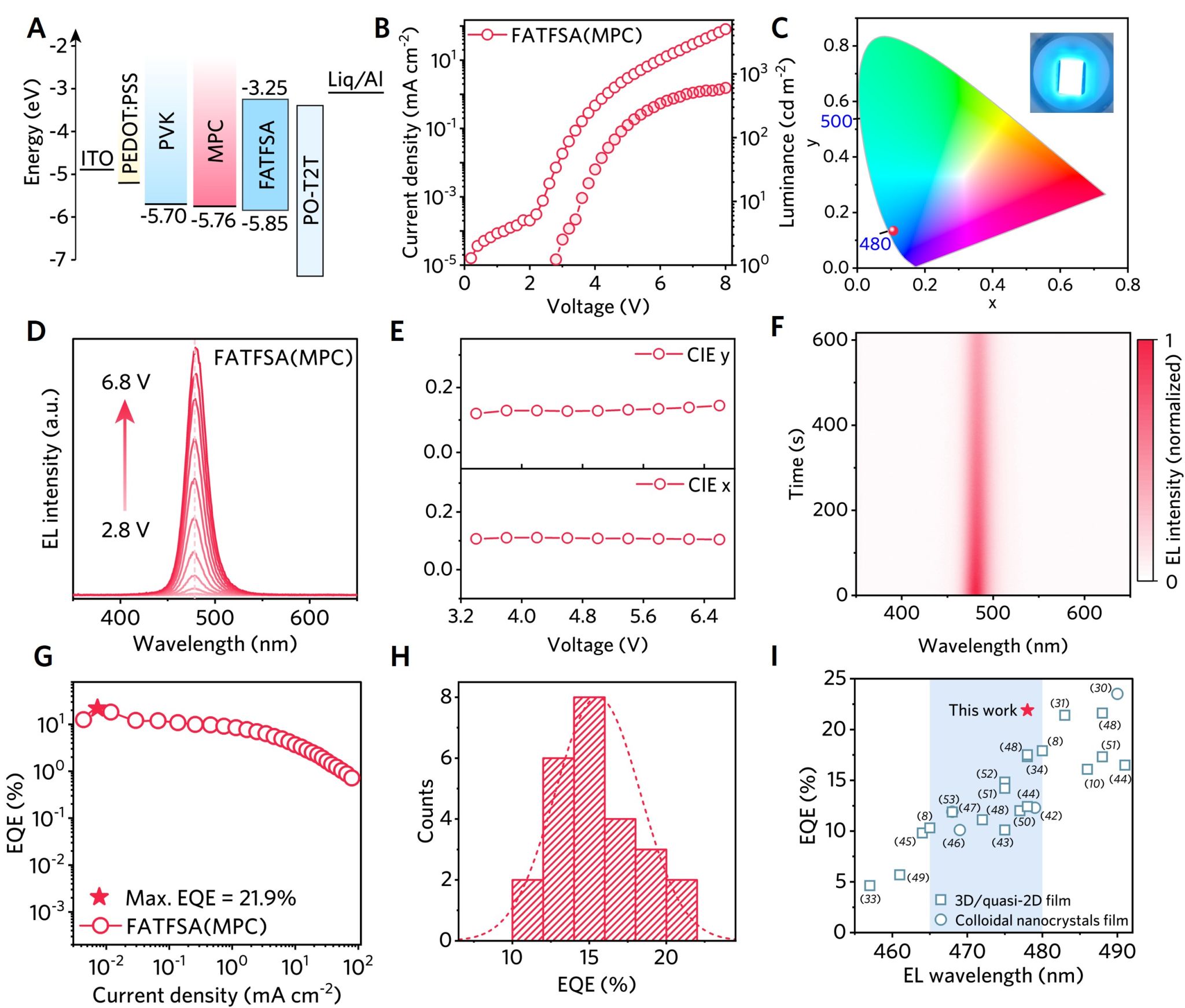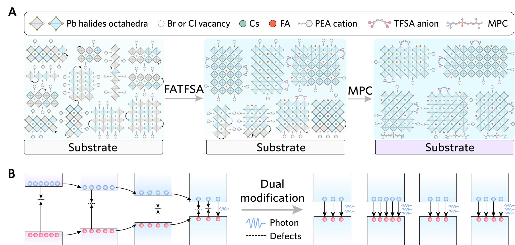 钙钛矿型发光二极管在显示屏和照明技术等领域展现了极大的应用前景。然而,蓝光设备的效率以及光谱的稳定性仍是亟待克服的关键难题。对于准二维钙钛矿,普遍存在低维相形成的不可控现象,这导致了能级分布的不均匀,进而引起载流子的非辐射复合,影响其发光效率。同时,混合卤素钙钛矿中引入的氯离子易产生缺陷和离子迁移,导致相分离,使得薄膜能量分布混乱,不利于提升器件效率和光谱稳定性。通过向钙钛矿前驱体溶液中加入多功能添加剂四氟丁二酸甲脒,显著提高了钙钛矿薄膜的发光均匀性和亮度,并且荧光寿命得以延长,这表明缺陷被有效钝化,非辐射复合现象减少。理论计算指出,氯离子的迁移被显著抑制,有利于增强光谱和运行稳定性。添加四氟丁二酸甲脒后,钙钛矿薄膜中的低维相显著减少,促进了能量的快速传递和载流子的辐射复合。进一步地,在钙钛矿与空穴传输层界面采用双亲性分子进行修饰,不仅降低了界面能量损失,还抑制了低维相的形成,从而提高了能量分布的均一性。采用这种策略,成功制备出了具有稳定光谱的蓝光发射(478 nm)和峰值外部量子效率为21.9%的钙钛矿发光二极管,这一成果代表了同类器件的顶尖水平,为开发高性能蓝光钙钛矿发光二极管提供了一种有效的解决途径。