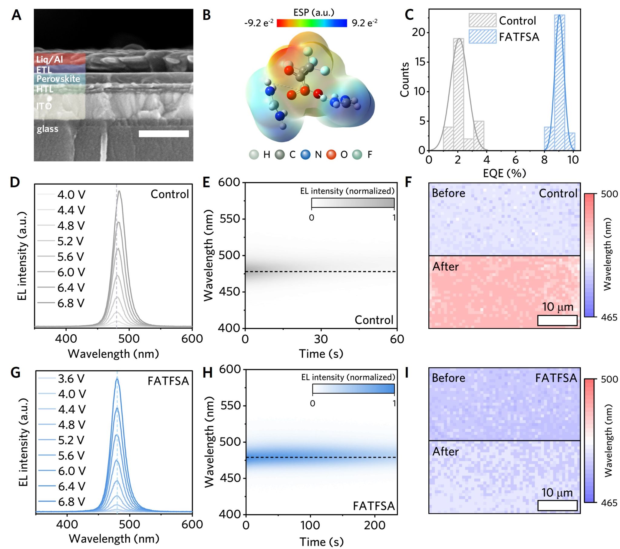 图2 . 四氟丁二酸甲脒提升钙钛矿发光二极管性能的机理研究。
