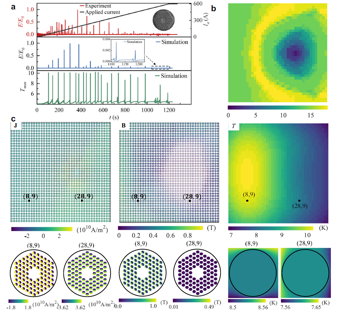 针对上述难题,力学与土木建筑学院薛存副教授团队提出了一种开创性的大规模GPU并行数值算法,在国际上首次实现了数值模拟真实尺寸千匝级超导磁体跨尺度复合结构在励磁过程中电磁、温度和应变多物理场的错综复杂交织效应。利用该数值方法,进一步揭示了力学作用下超导线圈磁-热不稳定性(包括磁通跳跃和失超)的动态传播机制。该方法已经应用于中国科学院近代物理研究所离子源Nb3Sn超导磁体线圈的分析,揭示了Nb3Sn超导线圈复杂磁通跳跃现象的形成机制。该研究结果将可能成为未来高场磁体、特别是高场内锡法Nb3Sn超导磁体优化设计的重要理论工具。