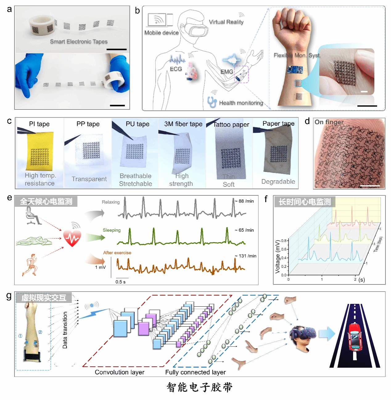 长期生物电位采集对各种疾病的早期检测和及时治疗具有重要意义。目前,标准的银/氯化银(Ag/AgCl)凝胶电极在长时间佩戴时可能会引起皮肤刺激,且在不同个体上重复使用电极可能导致交叉感染的风险。为了和皮肤更好的贴合以获得更高的信号质量,超薄的薄膜电子器件常受到研究人员的青睐,但是其制备工艺大多较为复杂、操作难度高、且器件强度有限,难以实现大批量、低成本制备。除了超薄薄膜,液态金属也因其优异的可塑性以及与皮肤的无缝接触而被广泛用作生理电电极。但液态金属基电极操作相对复杂,此外其生物相容性不确定,不适合长期佩戴。因此,开发自粘性、超稳定耐用、低成本、与皮肤无缝接触的电极以长期监测生理电仍是一个挑战。