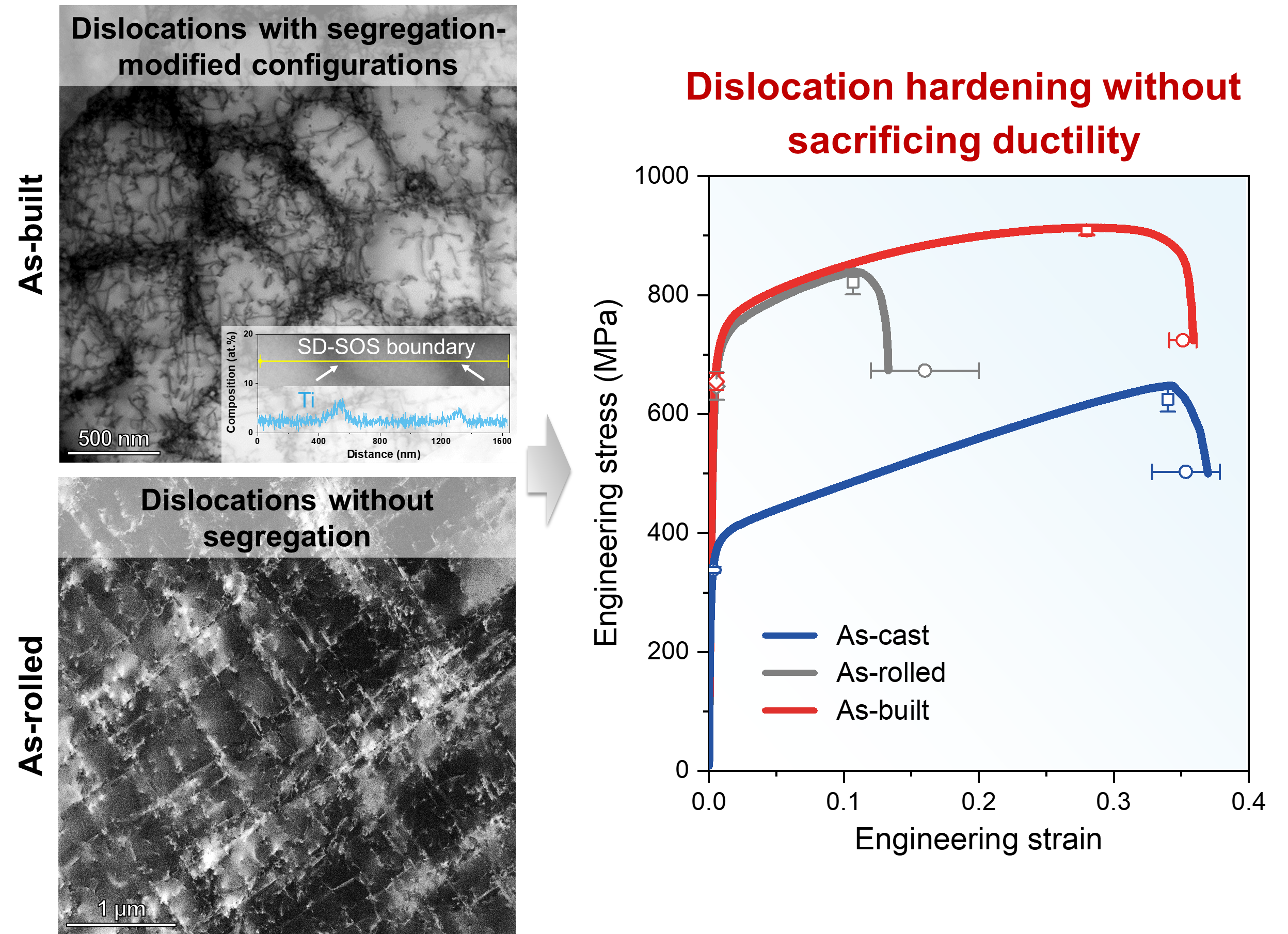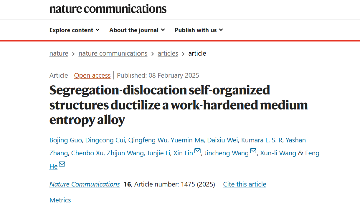 相关成果以“Segregation-dislocation self-organized structures ductilize a work-hardened medium entropy alloy”为题,发表于国际著名期刊《自然·通讯》(Nature Communications),西北工业大学为论文的唯一通讯单位。西北工业大学何峰教授、王锦程教授、林鑫教授为共同通讯作者,博士生郭博静为第一作者。
