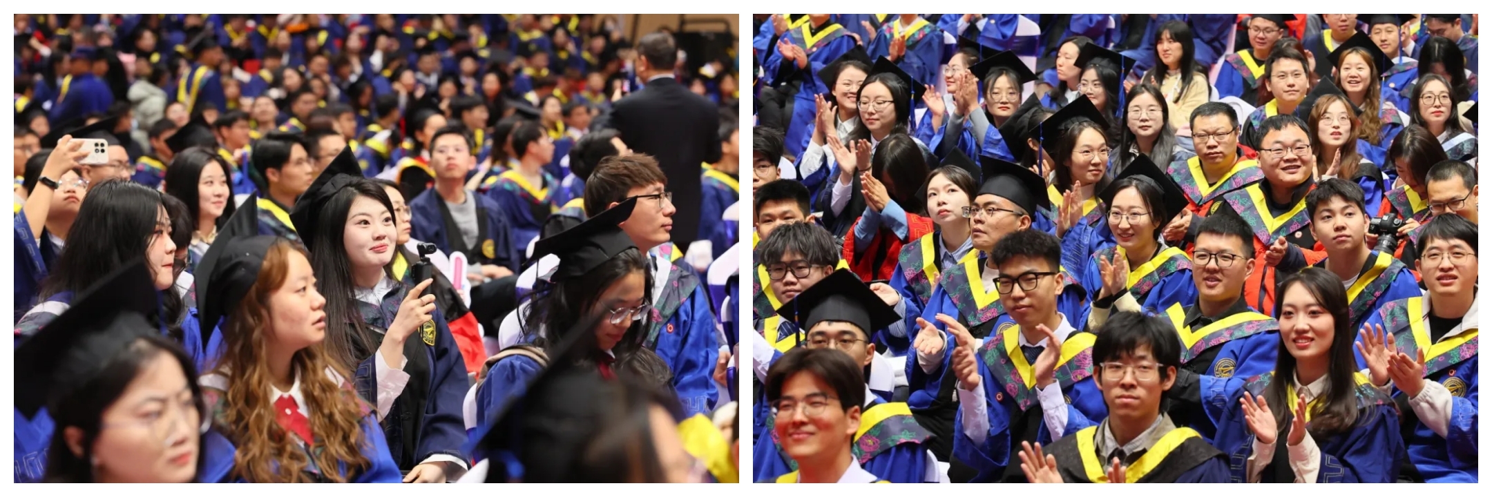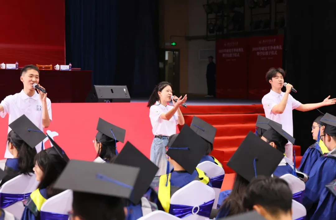 典礼前,还播出了毕业纪念视频《青春答卷》,用镜头定格欢乐、汗水与收获,祝福每位毕业生“于道各努力,千里自同风”。随后,国家级领军人才、教学名师、青年教师、毕业生代表联袂教授合唱团的老师、大学生艺术团的同学们联唱了《再见》《离别开出花》《启航》等歌曲,并与全场师生再次合唱《祖国不会忘记》,离别的感伤、启航的憧憬、赤诚的誓言在翱翔体育馆里交织,凝结成秦岭脚下大美校园里最璀璨的春光。