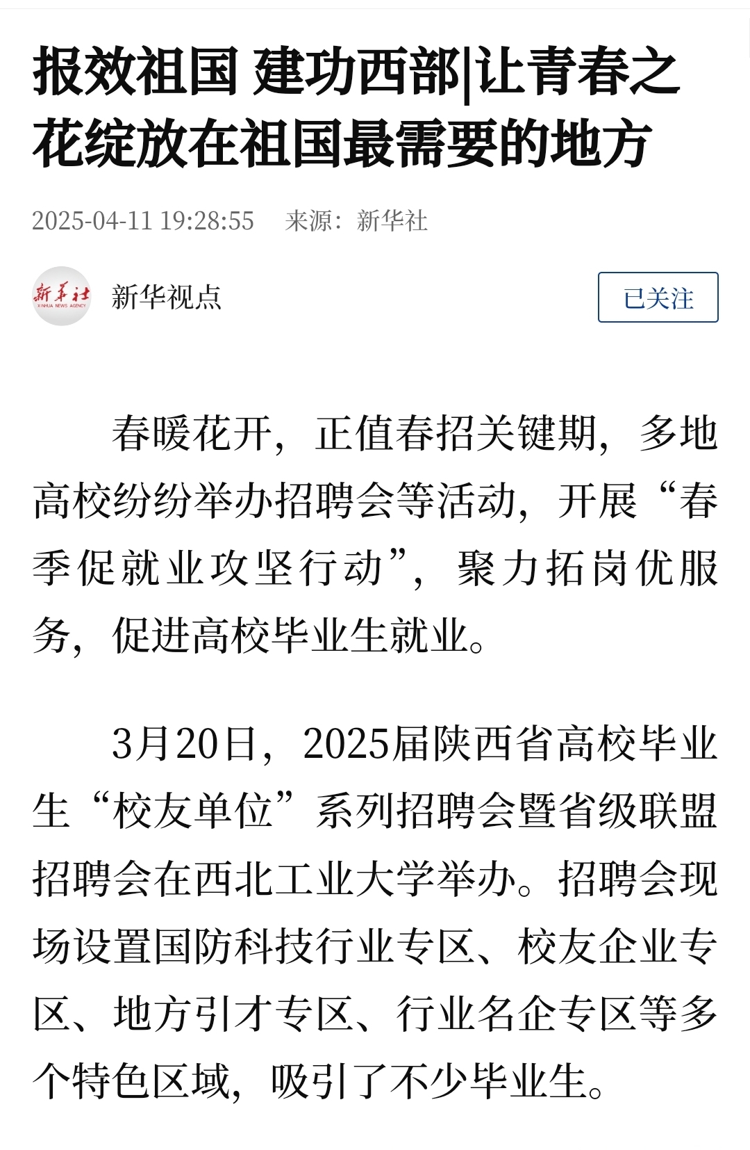 4月11日,新华社刊发重点报道《报效祖国 建功西部|让青春之花绽放在祖国最需要的地方》。文章对鸭脖官网学子扎根西部、献身国防的事迹进行了重点报道。