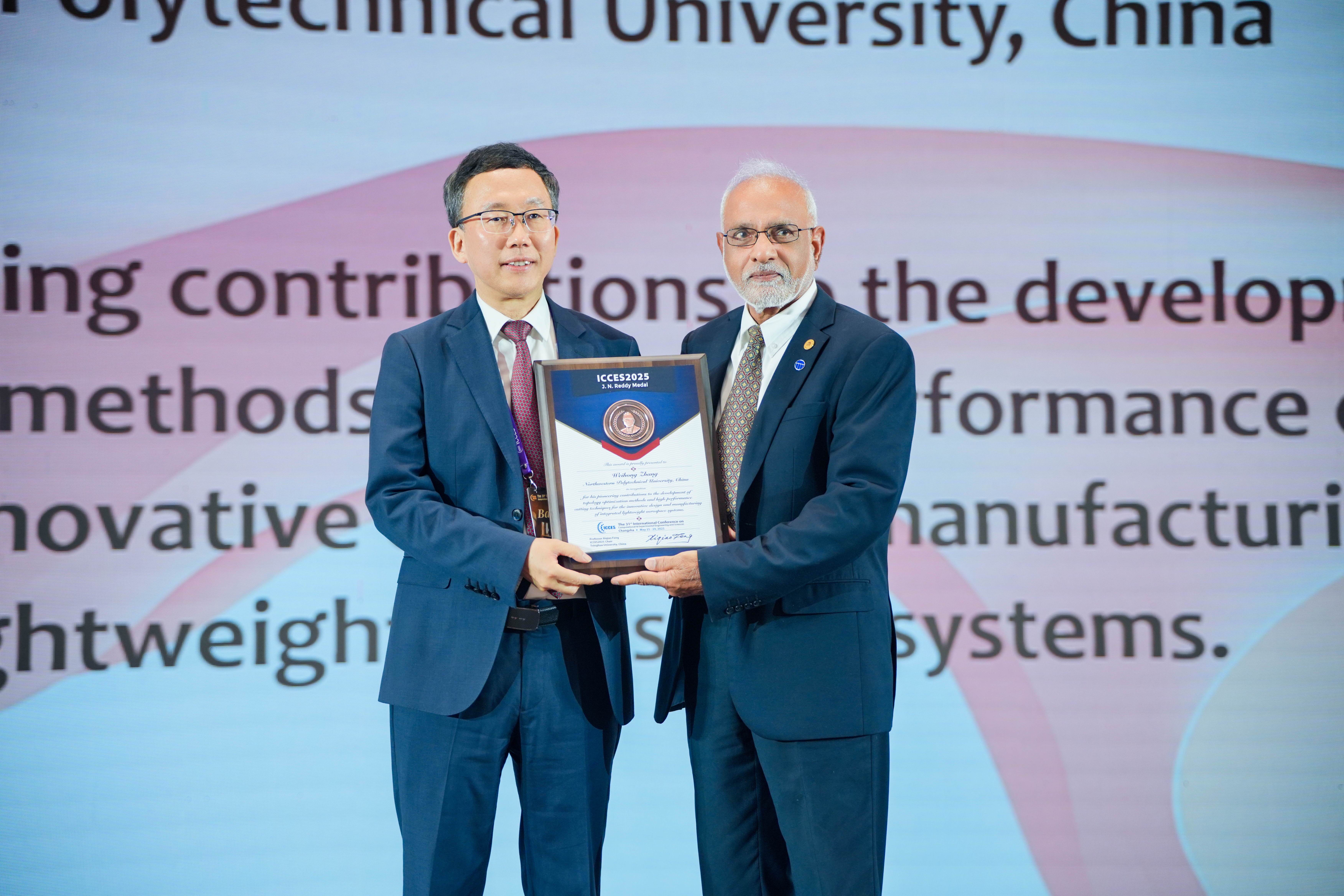 近日,在长沙举办的第三十一届计算与实验科学工程国际会议(ICCES 2025)上,鸭脖官网张卫红院士荣获在力学领域享有盛誉的J. N. Reddy奖章,以表彰他在航空航天结构系统拓扑优化方法与高性能切削技术所作出的开创性贡献。