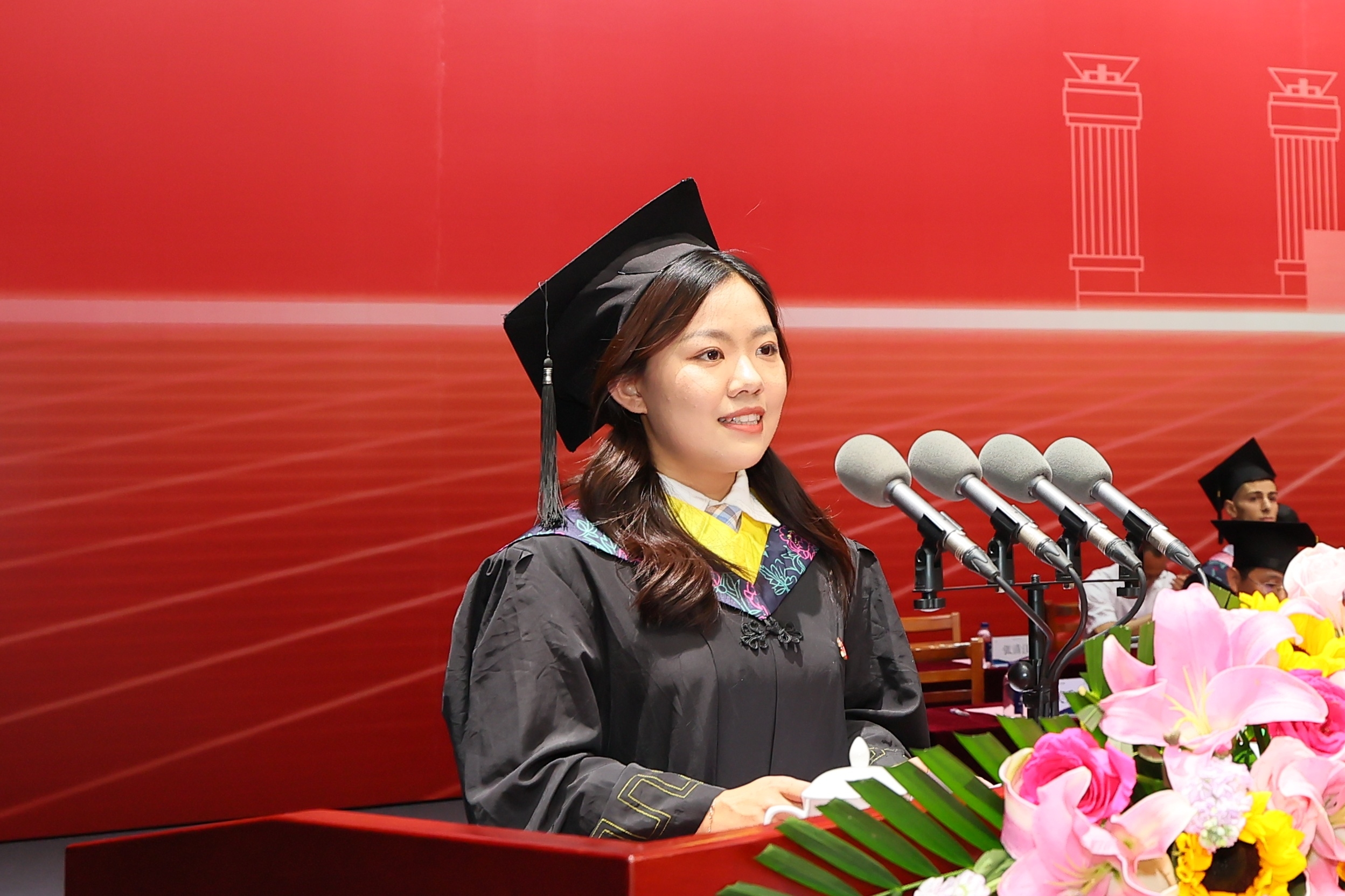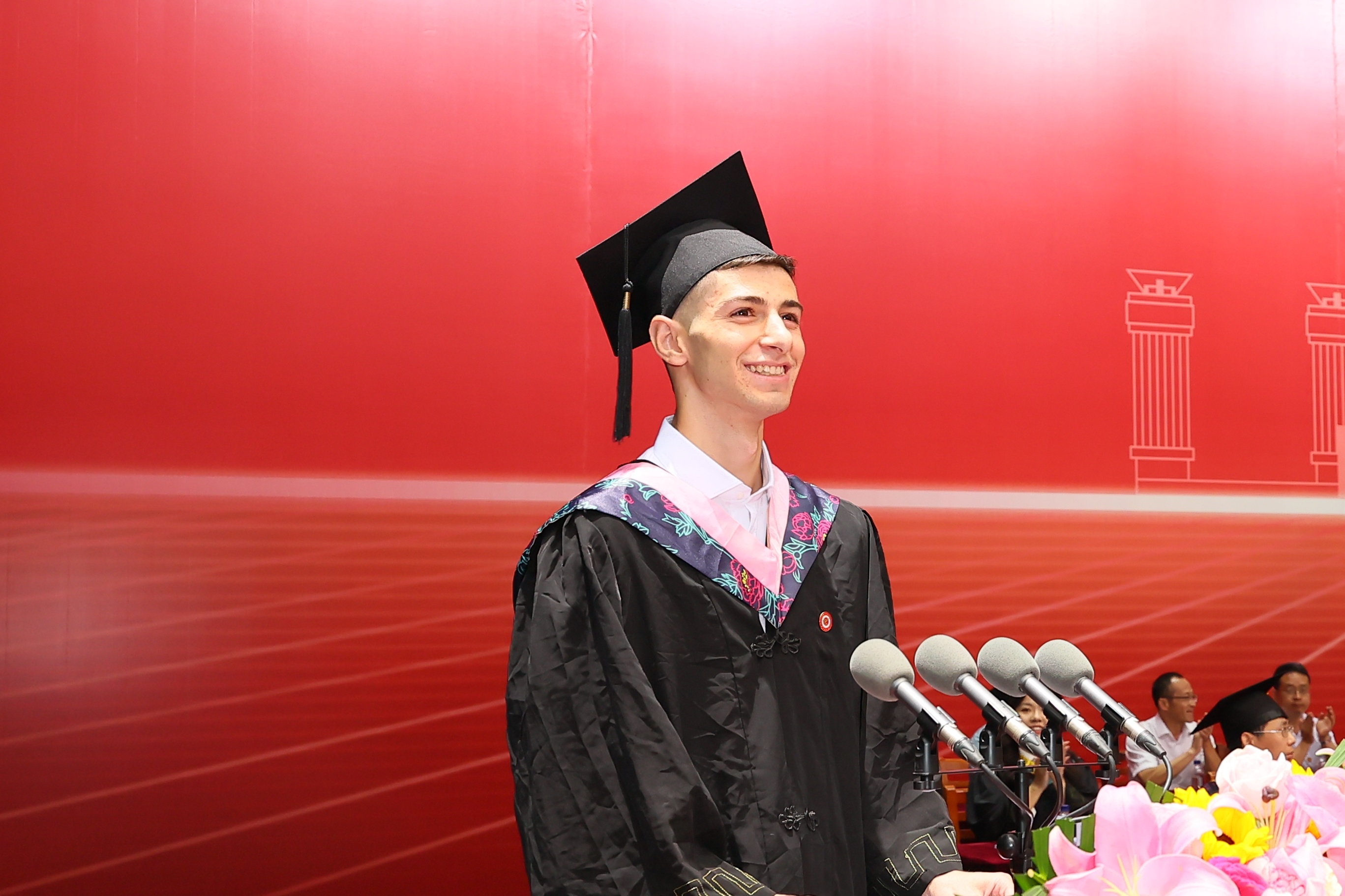 留学毕业生代表、公共政策与管理学院毕业生,来自亚美尼亚的埃里克同学说,母校的四年培养赋予了他“四重身份”:作为一位法律专业的学生,在西工大的学习让他牢记要做公平公正的法律人;作为一名工大学子,独有的工大美景浸润内心,让他笃定要做精神世界充盈丰盛的工大人;作为一名西工大校友,他将接过工大精神的接力棒,用成就书写“天下工大 世界三航”;作为一名文化交流的爱好者,他将继续做好文明交流的践行者和中国故事的讲述者。