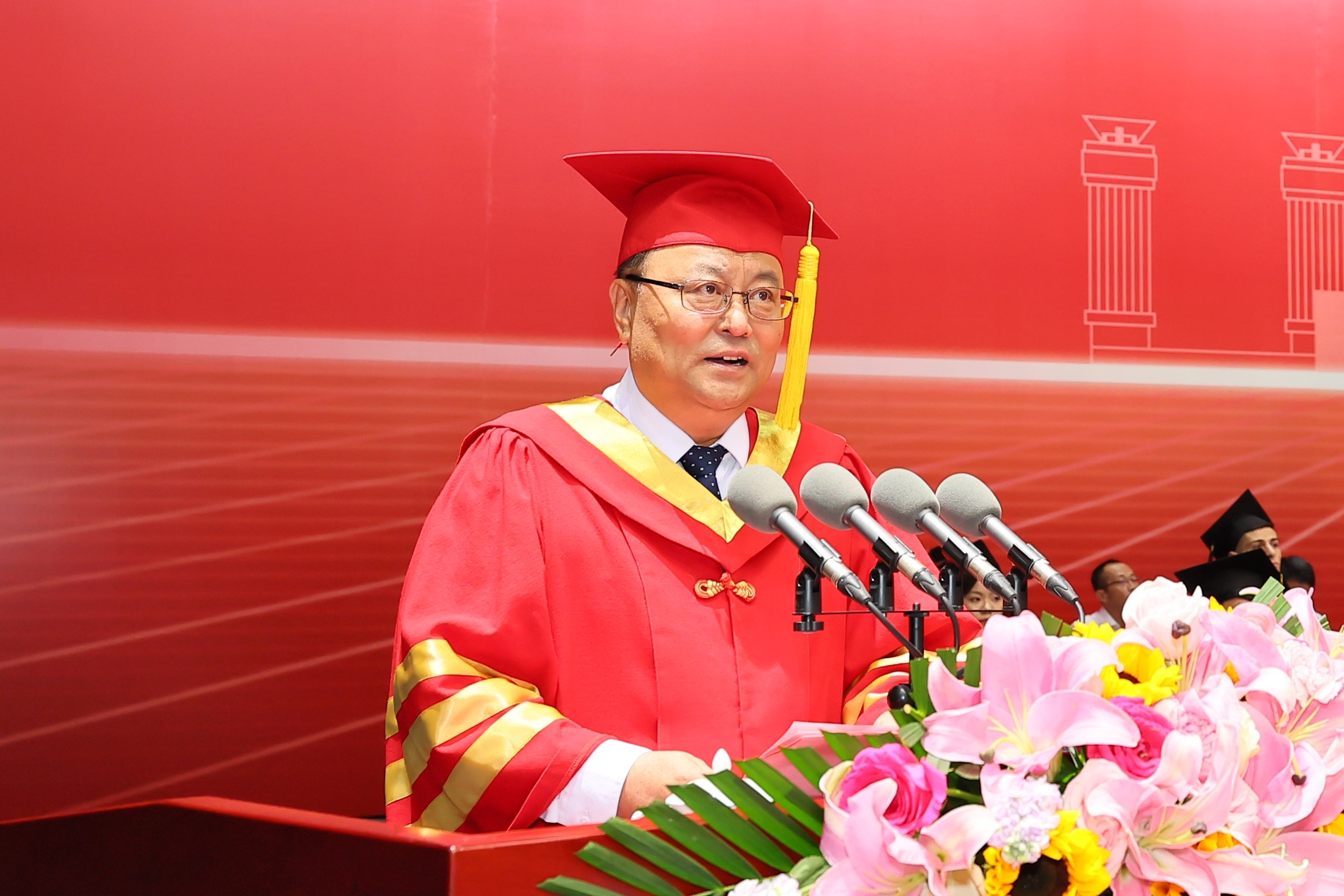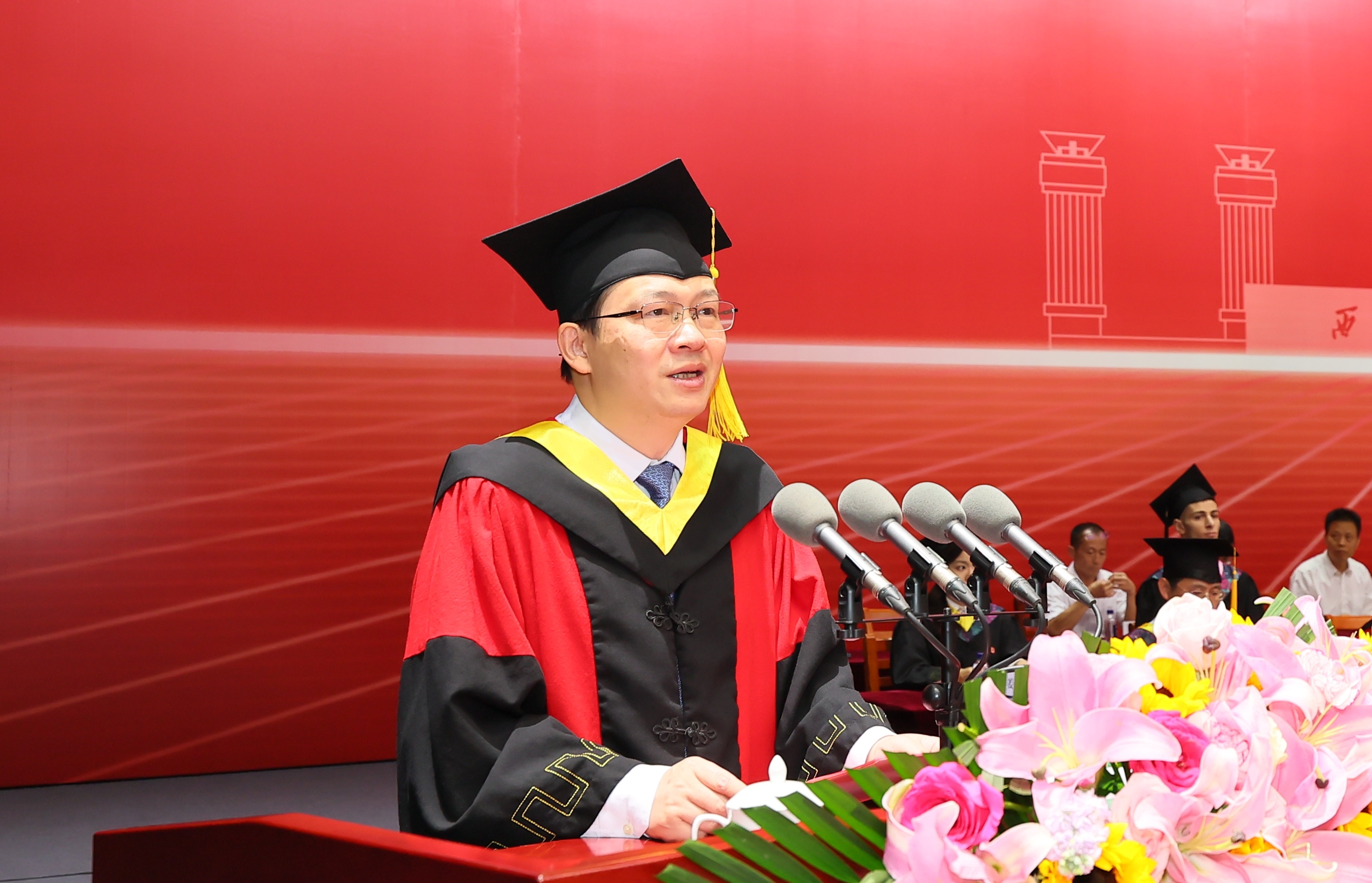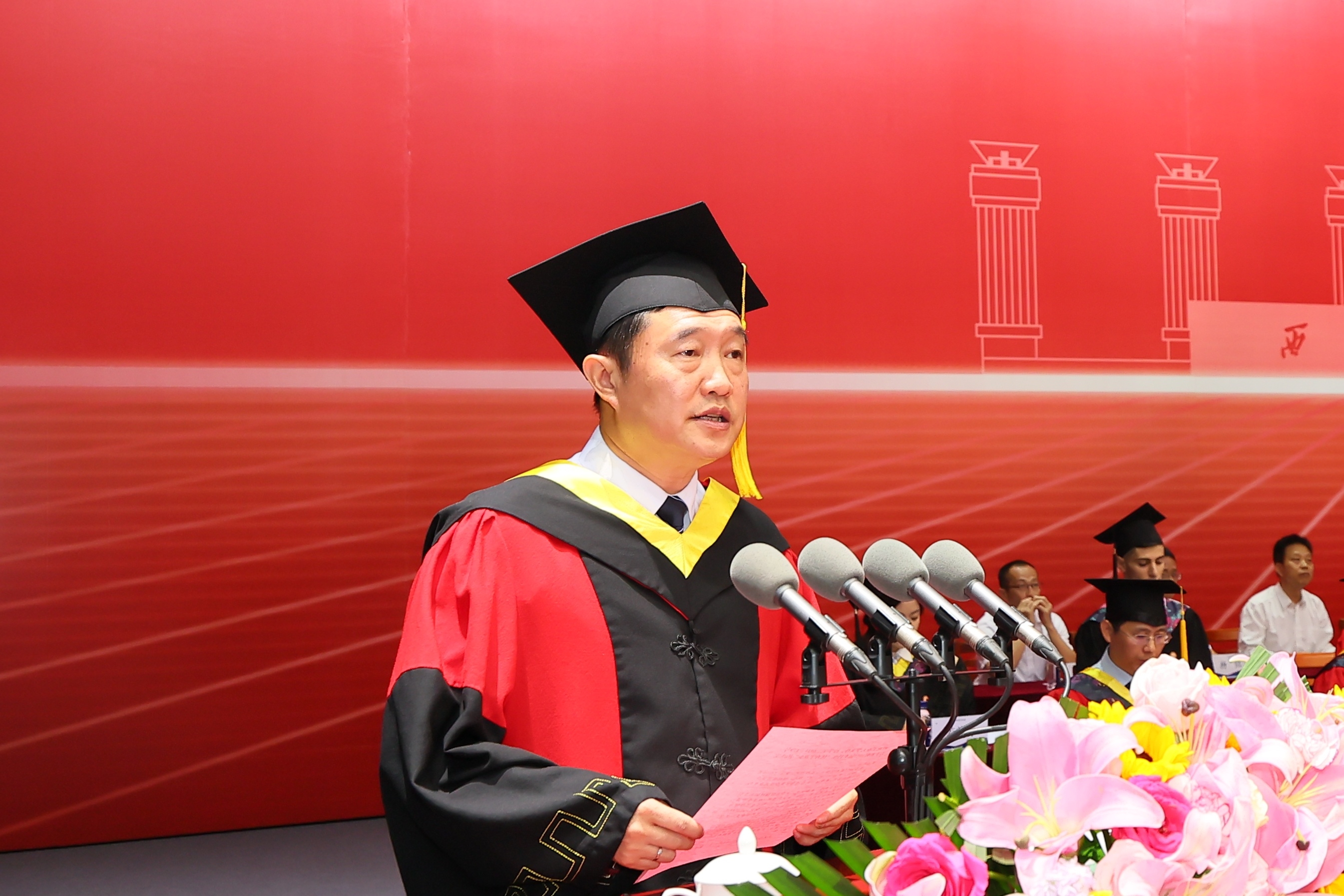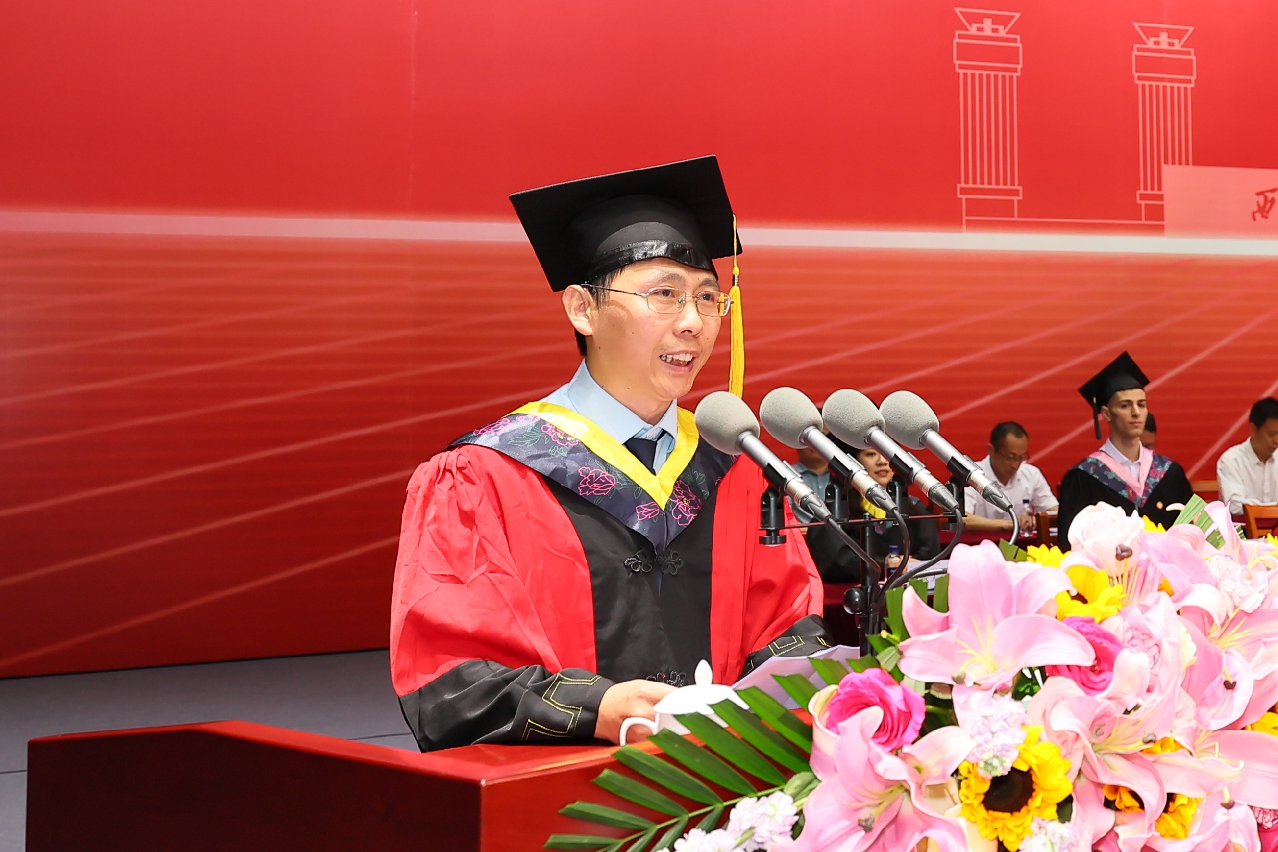 教师代表、材料学院院长付前刚代表全体教师,为即将奔赴人生新阶段的同学们,送上最热烈的祝贺和最诚挚的祝福。他用三句话寄语即将远行的学子们:一是目标要“准”,只有把个人的奋斗目标和强国建设、民族复兴的宏伟目标融为一体,与时代同步伐、与人民共命运,才能更好实现人生价值、升华人生境界;二是视野要“宽”,不仅要深耕自己的专业领域,还要关注跨学科的发展,积极融入全球创新网络,不断拓展自己的知识边界和能力范围;三是扎根要“深”,要保持十年磨一剑的韧劲,一步一步往前走,就一定能走好属于自己的壮阔征途。