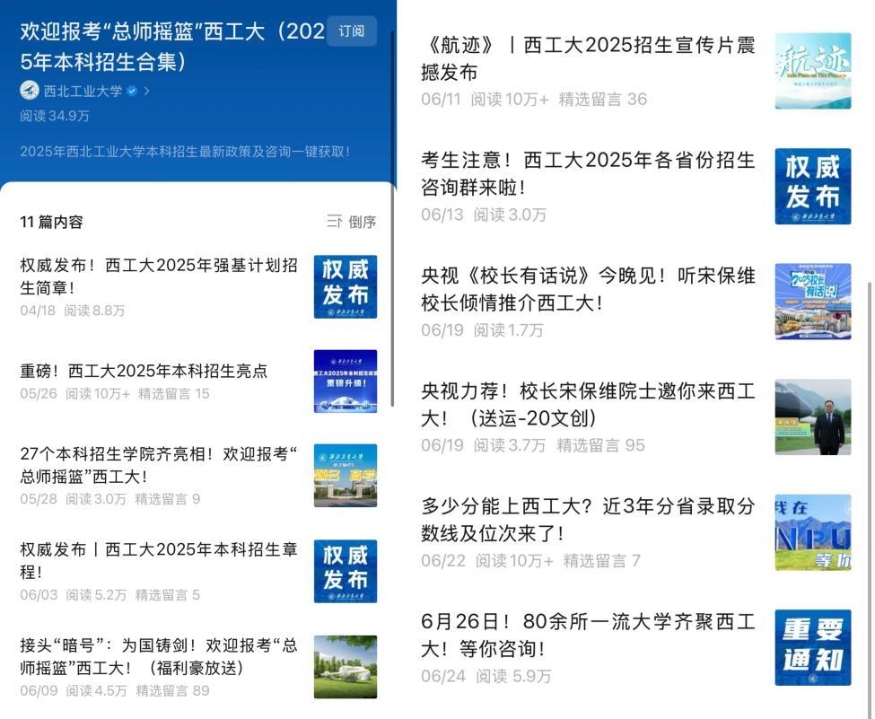 重磅推出西工大2025年本科招生宣传片《航迹》,官微浏览迅速突破10万+,全平台播放量突破150万。“西工大招办”视频号、抖音和B站平台,精心打造多个爆款小视频,总浏览量近700万,创历史新高,其中,策划制作的“看珠海航展上的西工大力量”等校友总师系列短视频在网络广受好评。通过“西工大官微”“西工大招办”等微信公众号累计发布推文140余篇,在学校官微推出“欢迎报考‘总师摇篮’西工大(2025年本科招生合集)”,其中3篇单篇阅读量超10万+;官方微博、视频号、抖音、小红书等平台同步发力,策划推出了“运-20进校园”“你可能不了解我,但你应该听说过...”“西工大祝你金榜题名”等20余条系列短视频,全网累计播放量破亿,并多次登上热搜,既“出彩”又“出圈”。