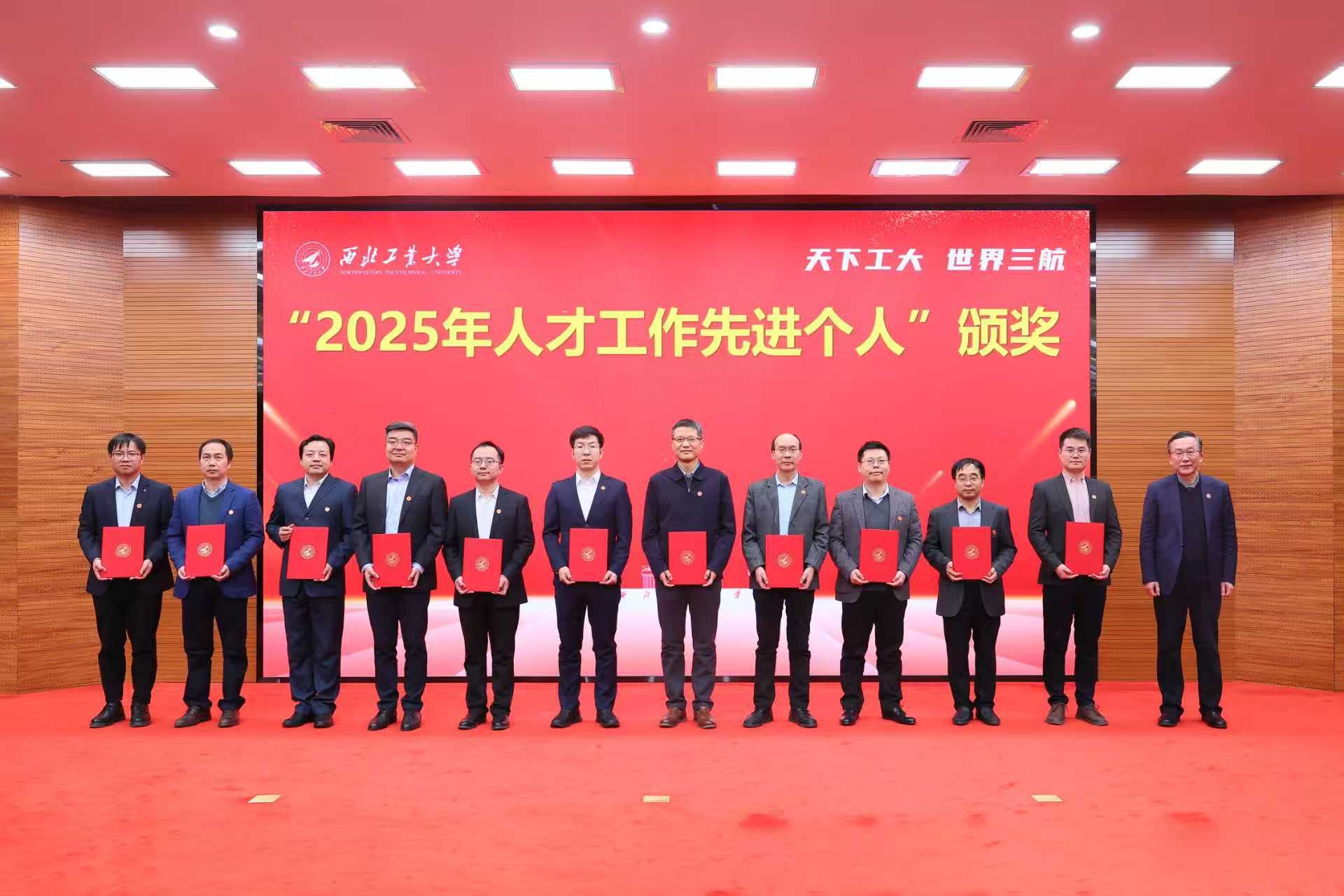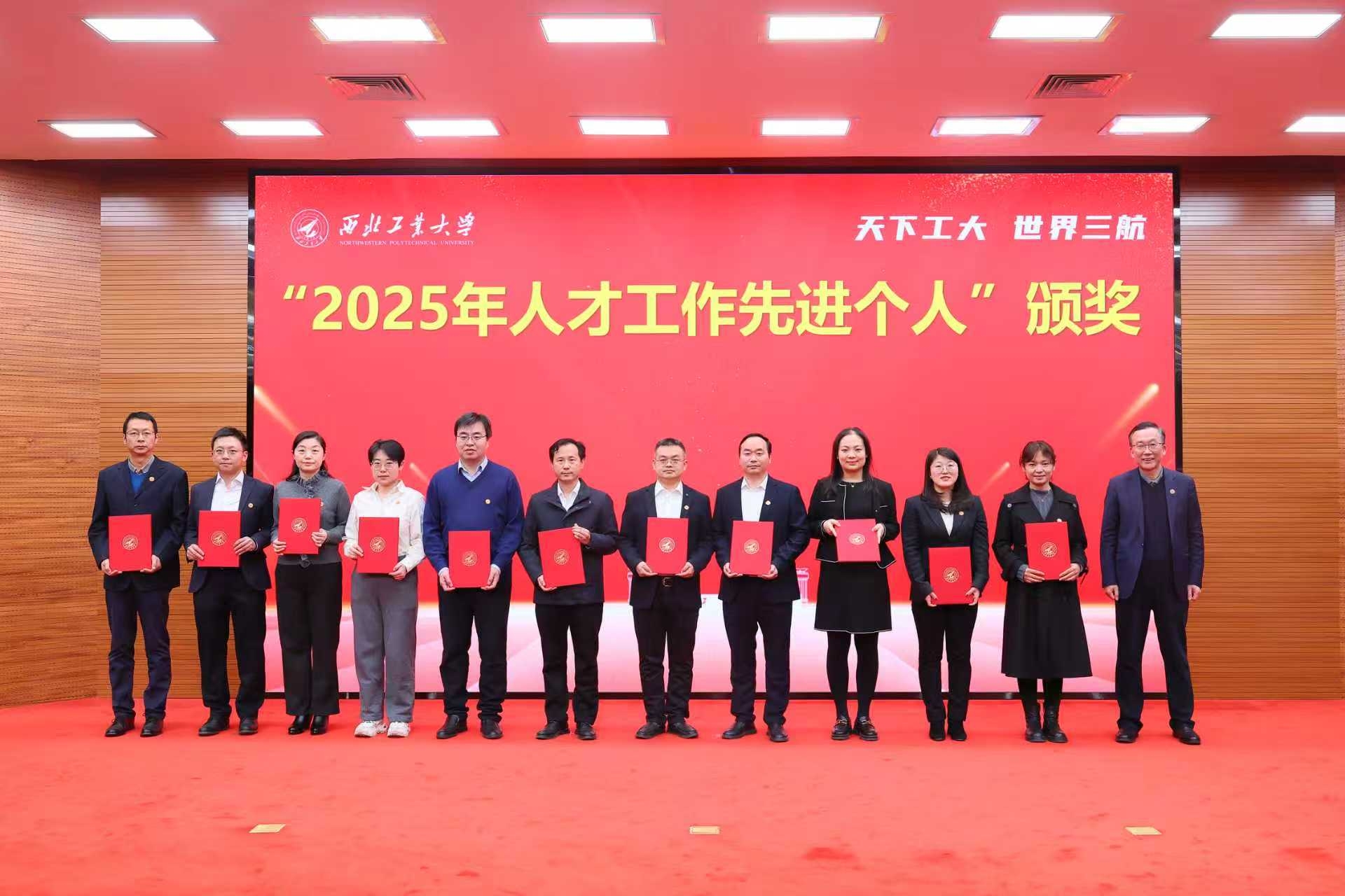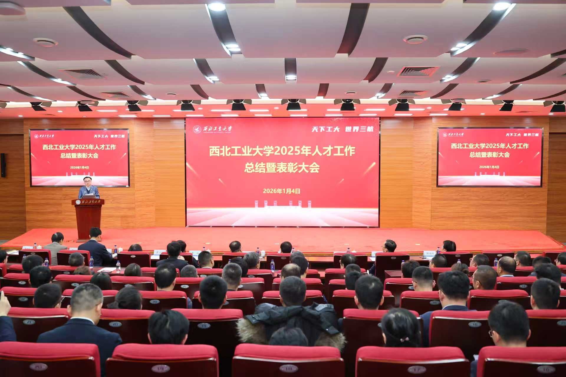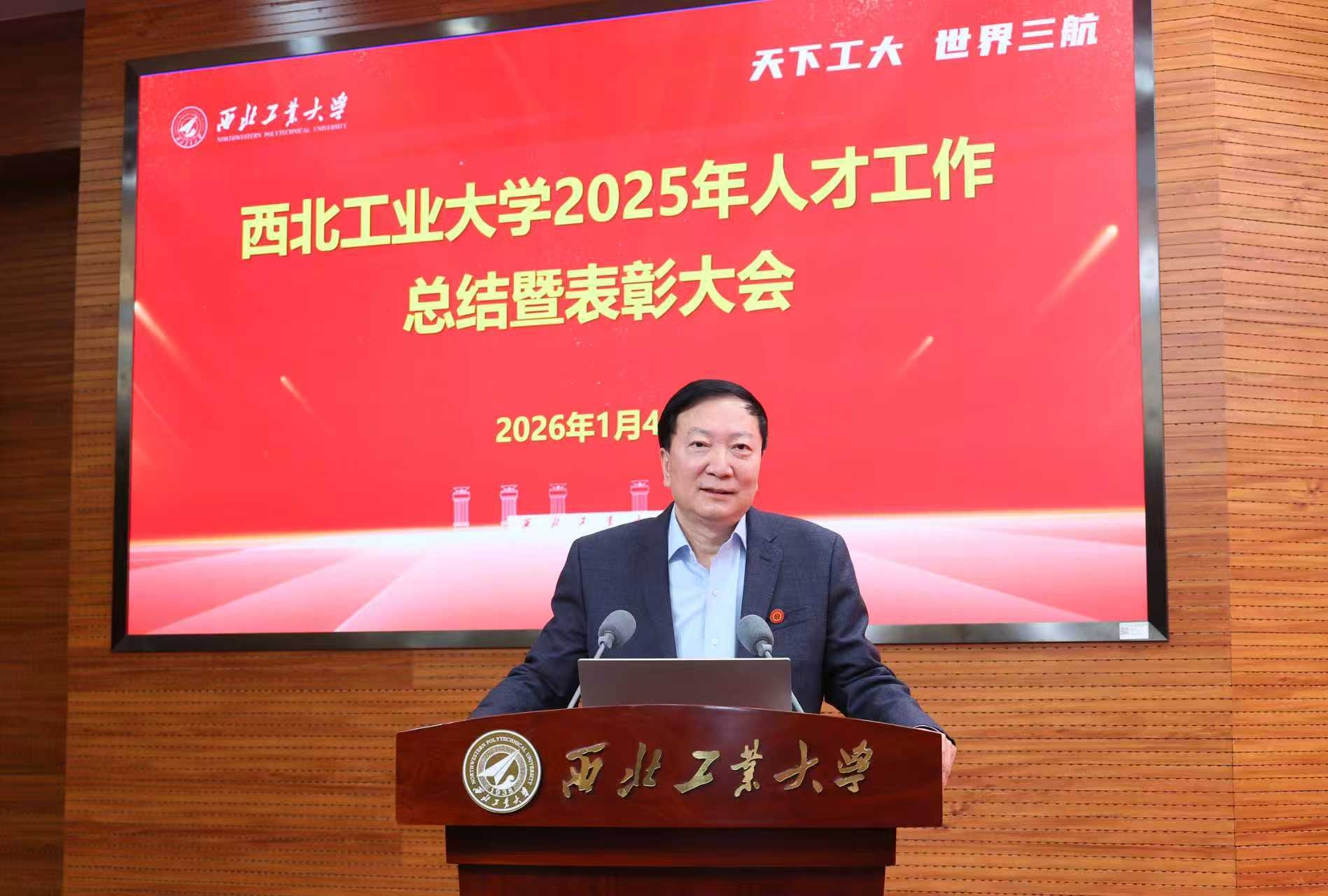 1月4日下午,西北工业大学2025年人才工作总结暨表彰大会在友谊校区举行。党委书记李言荣出席并颁奖、讲话。校长宋保维出席并颁奖。校学术委员会主任黄维院士,校务委员会副主任张卫红院士,副校长张艳宁院士,中国科学院院士杨坤德,副校长张富利参加。会议由党委常务副书记吕卫东主持。