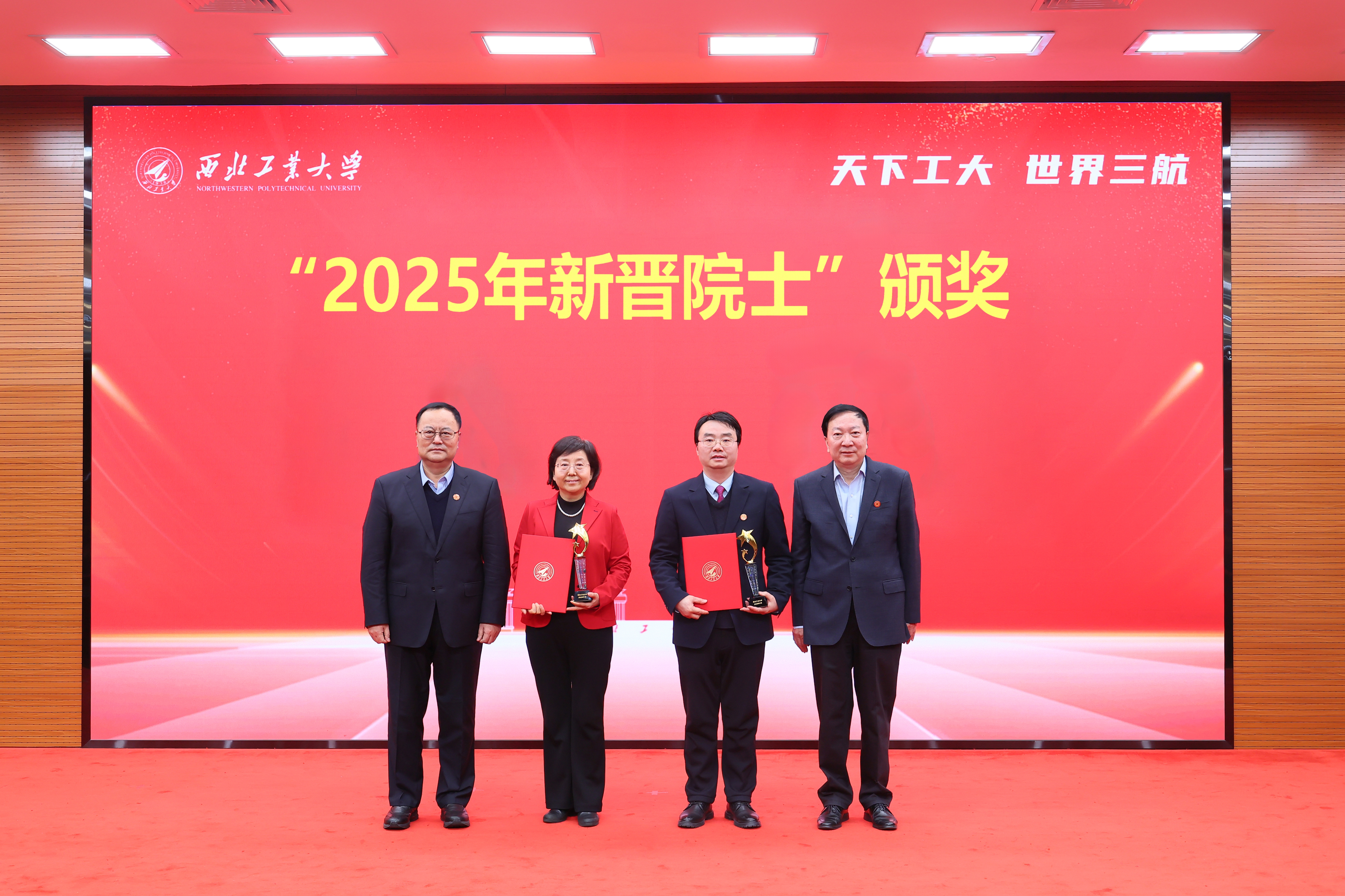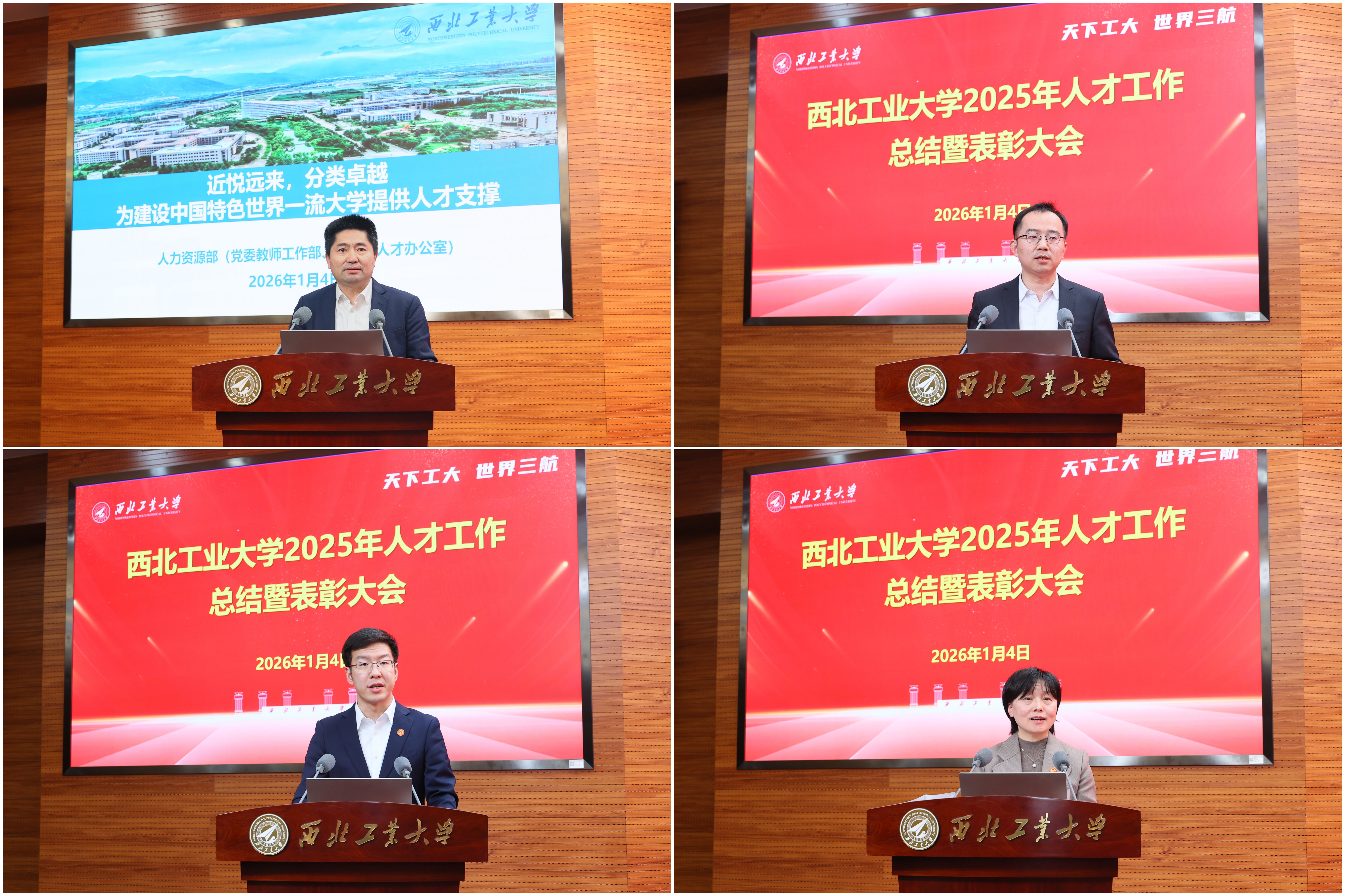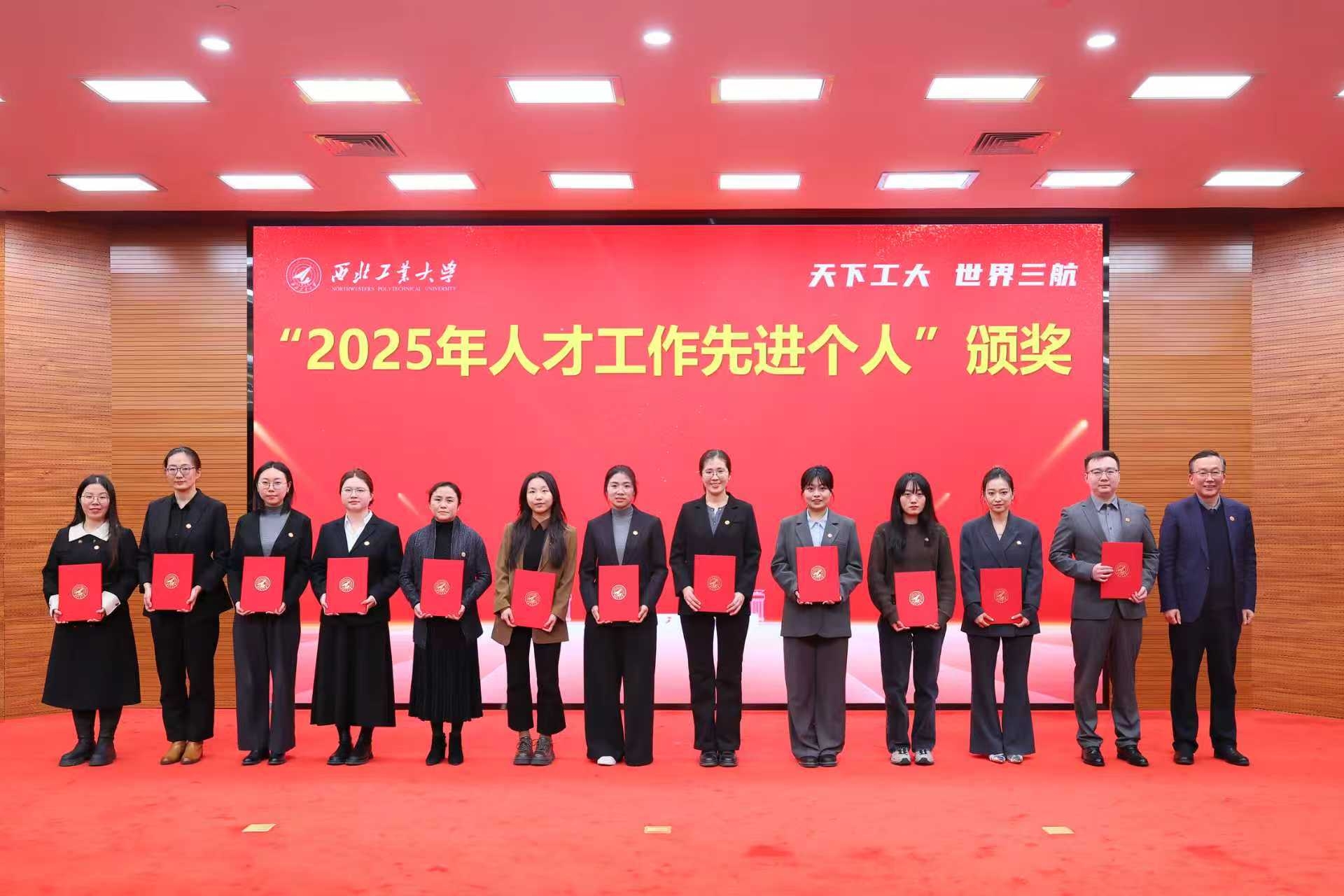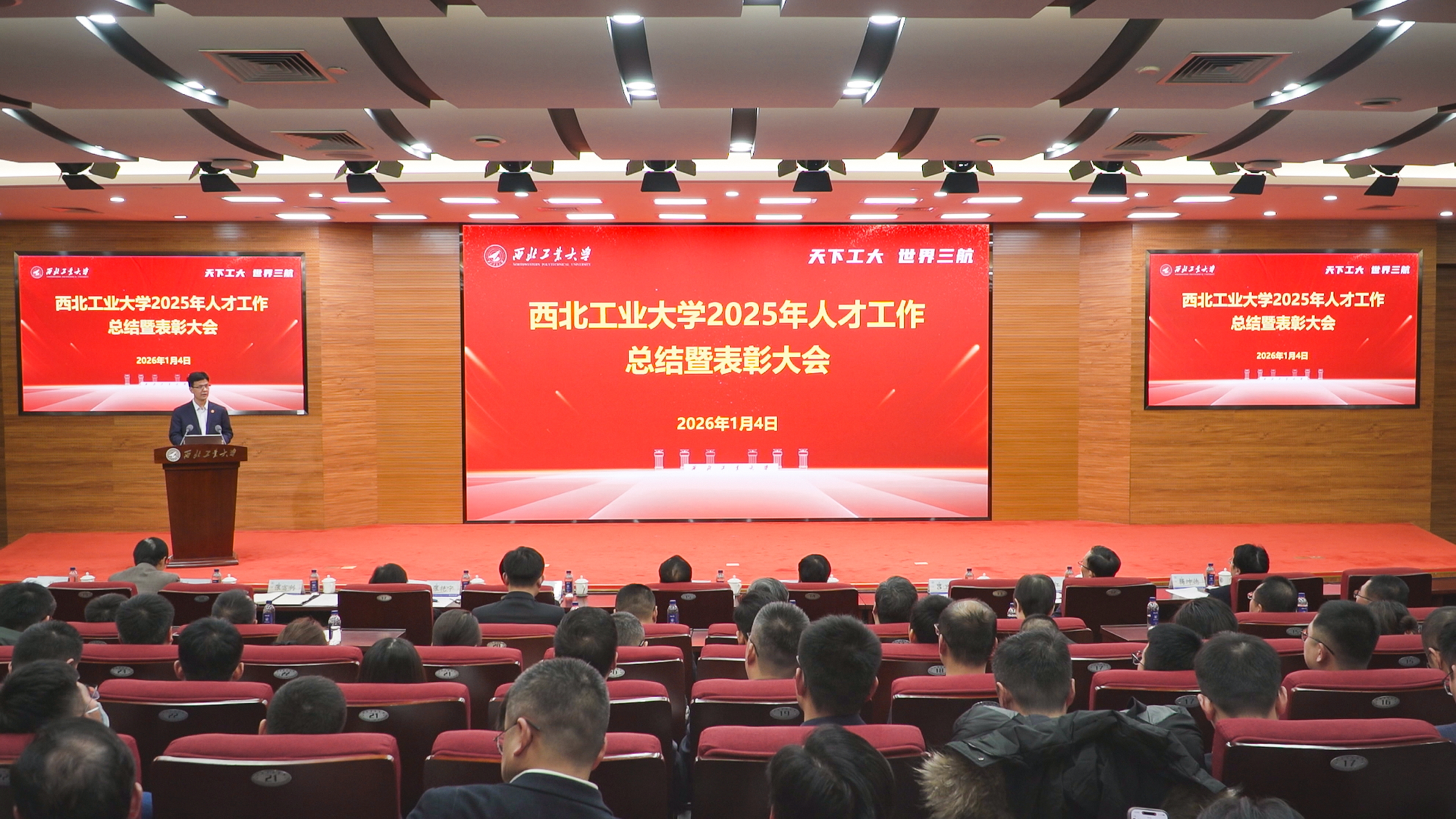 1月4日下午,西北工业大学2025年人才工作总结暨表彰大会在友谊校区举行。党委书记李言荣出席并颁奖、讲话。校长宋保维出席并颁奖。校学术委员会主任黄维院士,校务委员会副主任张卫红院士,副校长张艳宁院士,中国科学院院士杨坤德,副校长张富利参加。会议由党委常务副书记吕卫东主持。