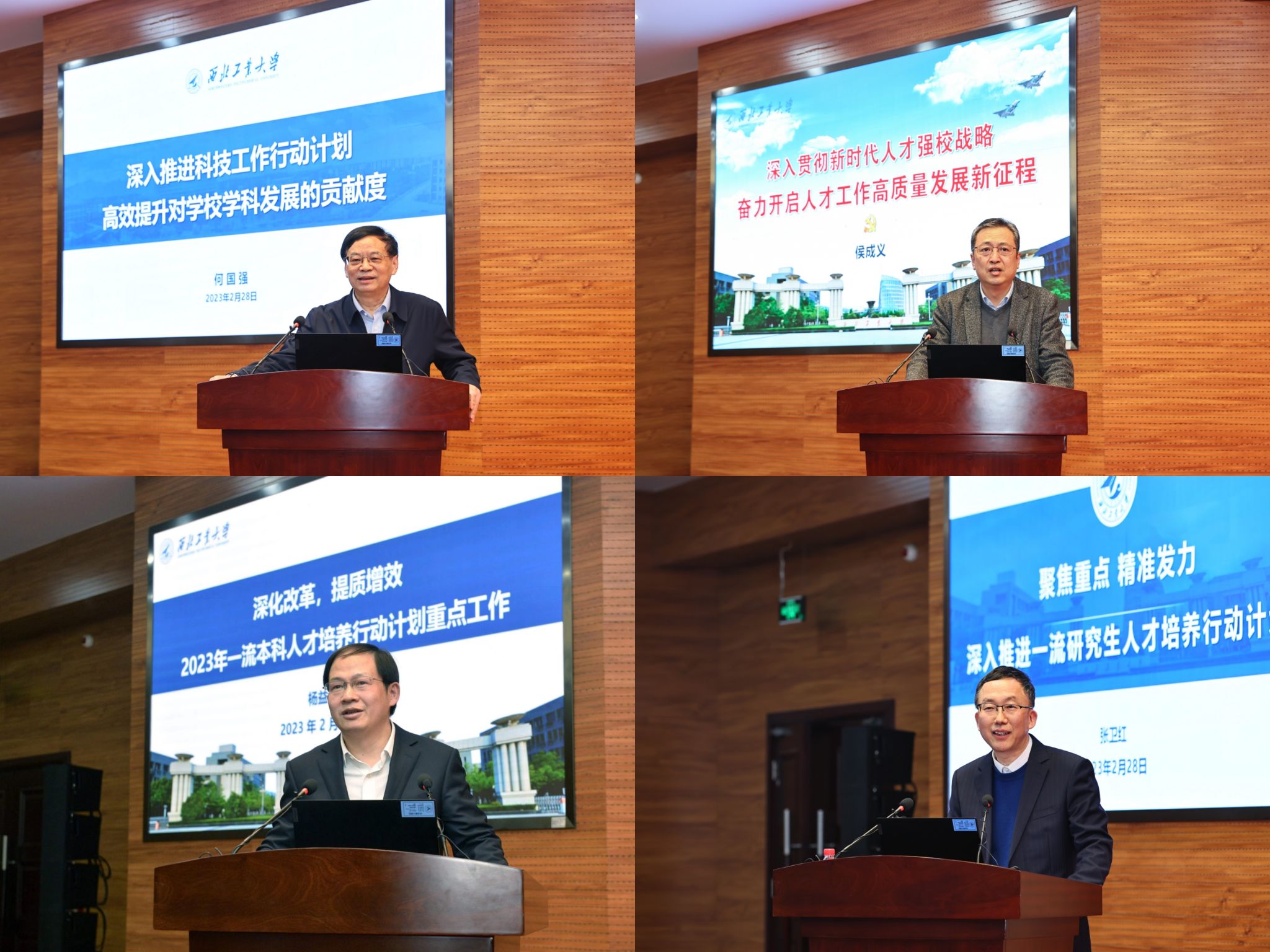 副校长杨益新回顾了一流本科人才培养行动计划总体情况,介绍了2022年一流本科人才培养行动计划重要进展,分析了新形势新问题,对2023年一流本科人才培养行动计划重点工作进行了部署。要深入学习贯彻党的二十大精神,持续完善西工大特色人才自主培养体系,坚持立德树人根本任务,深化拔尖创新人才培养机制改革,以服务支撑中国式现代化为牵引,全面提升人才自主培养质量。