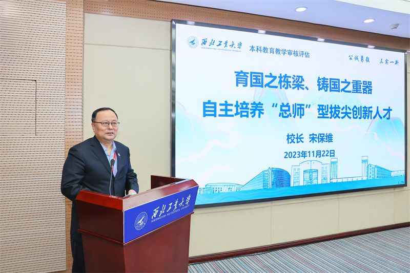 韩杰才代表评估专家组交流了审核评估总体情况。他指出,通过线上全面考察和入校深度核查,专家组一致认为,西北工业大学坚持和加强党的领导,全面贯彻党的教育方针,落实立德树人根本任务,为党育人、为国育才,“总师育人文化”深入人心,人才培养的优良传统继承巩固得好,“总师”型人才培养创新发展得更好,办学核心竞争力提升显著,全校积聚力量形成了一种迸发态势,呈现出情怀深厚、蓬勃向上、追求卓越的精神风貌。尤其是,学校坚持“总师育人文化”引领人才培养,构建了人才培养的大思政工作格局;学校坚持人才培养的中心地位,本科人才培养目标明确、特色鲜明、举措有力,源源不断为国家培养了一大批又红又专的优秀人才;学校坚持教育、科技、人才三位一体融合发展,持续深化改革,系列创新成果融入了人才培养全过程。学校扎根西部、献身国防,人才培养质量和社会美誉度持续提升;国防军工特色和红色基因鲜明;学科建设取得了突破性进展;持续深化教育教学改革成效显著;科研型号系统集成能力强,坚持原始创新和集成创新并重,服务国家战略能力强。专家组认为,西工大本科人才培养工作形成了成效特色:一是党委统揽全局,系统谋划人才培养“大思政”格局;二是构建多维质量保障体系,“千方百计让学生成长成才”;三是夯实优质教育教学资源供给,深化改革保障卓越教学;四是弘扬“总师育人文化”,培养学生“专业精、系统强、重实践、能担当”的基本素养。