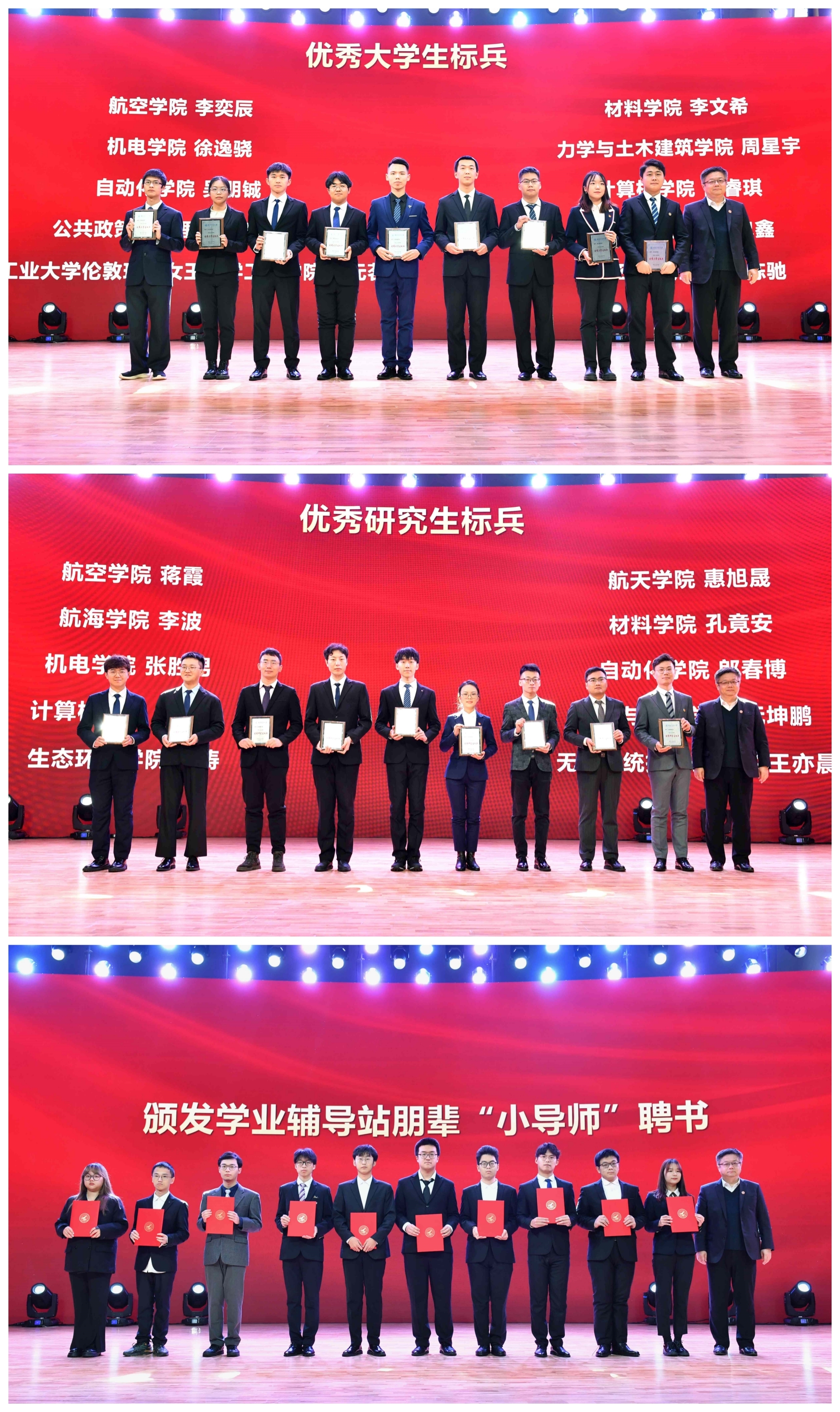 王宇波为优秀大学生标兵、优秀研究生标兵颁奖,为学业辅导站朋辈“小导师”颁发聘书。