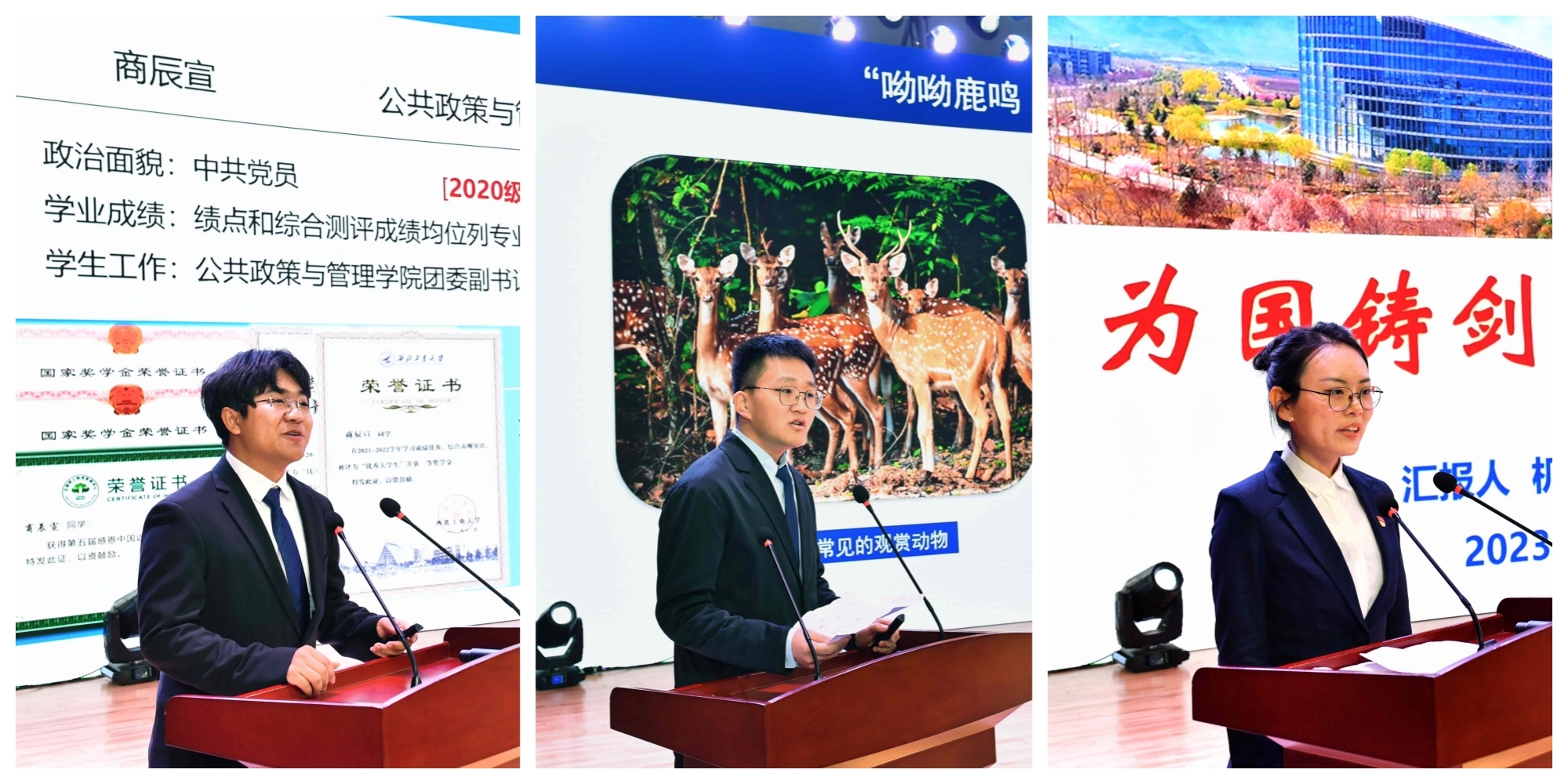 公共政策与管理学院2020级本科生商辰宣,作为优秀大学生标兵代表,讲述了学校因材施教,帮助自己在文科专业的学习中有效发挥理科优势,最终走出迷茫、茁壮成长的故事。研究生标兵代表、生态环境学院2020级博士生秦涛围绕在Science上发表鹿角再生相关研究成果的过程,分享了对科研的理解和体会,“科学研究没有诀窍可言,要俯下身子、沉下心来,一步一个脚印,在成功的路上慢一点也无妨。”机电学院2020级博士生张胜男结合长期聚焦复合材料风扇叶片制造这一业界“顶级难题”开展科研攻坚的经历,分享了在团队和导师的引领下,自己勇担强国使命,以“热爱”和“坚持”追逐“星辰大海”的感想感悟。