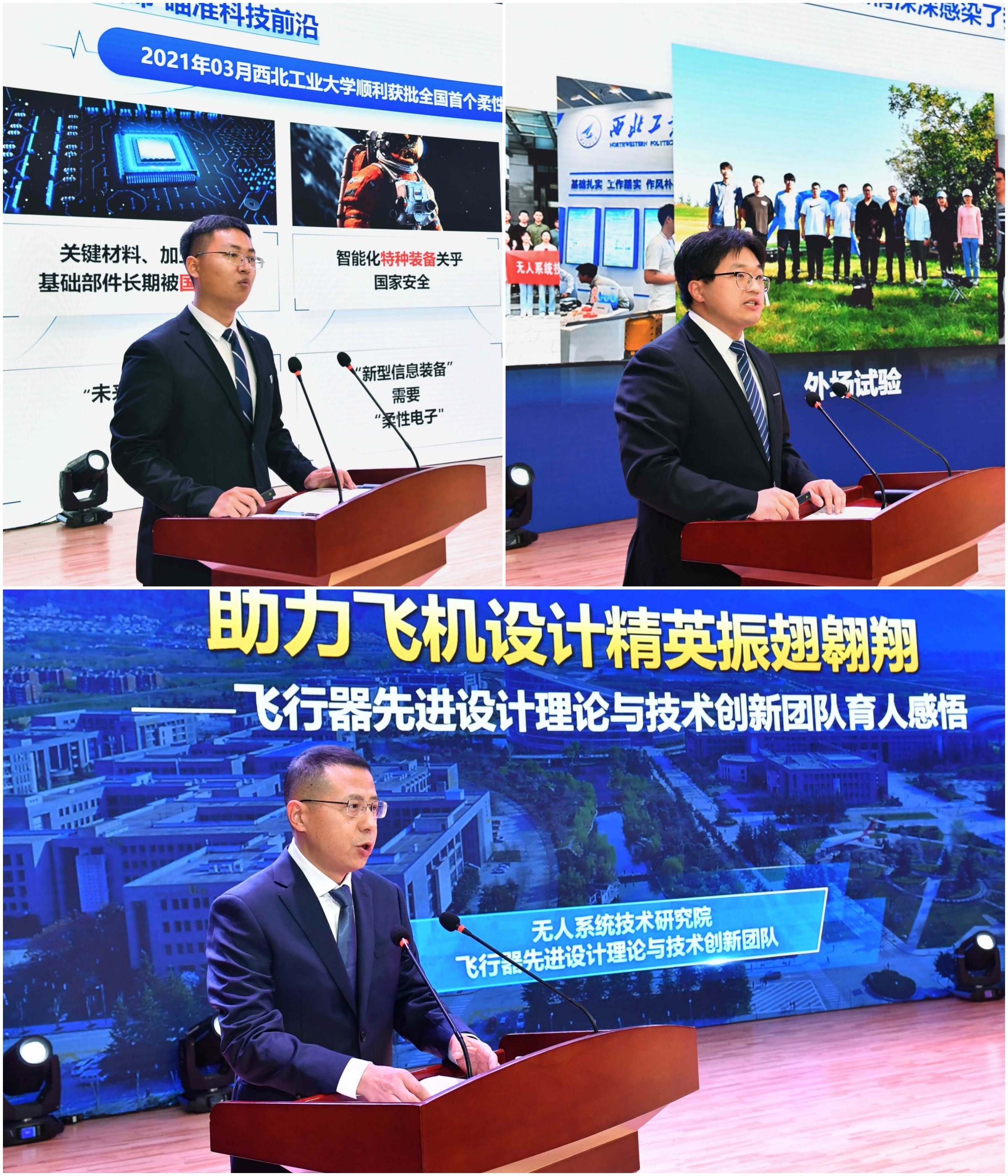 模范班级代表、教育实验学院HC002106班班长雷怡甫从“唯有心怀家国,方能笃行致远”“学习始终是我们的首要任务”“积极创新实践,全面开拓视野”等三个方面,分享了同学们作为全国首个柔性电子学本科班,坚定理想信念、勇担光荣使命,“瞄准科技前沿、点亮柔电之光”的青春故事。飞行器先进设计理论与技术创新团队负责人白俊强与博士生韩凯,作为模范研究生导学团队代表携手登台,共同讲述了团队服务国家战略需求,通过深度参与C919等重大项目型号任务教育引导学生“立大志向、上大舞台、入主战场、干大事业”,并凝练形成了“进大平台、学大本领、立大志向、成大总师”人才培养理念,以学习、科研中的“小切口”展现出“育国之栋梁、铸国之重器”的大主题。