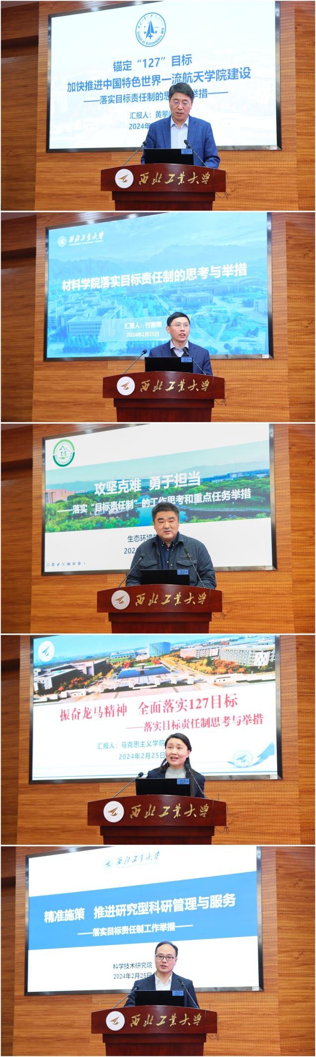 航天学院院长黄攀峰、材料学院院长付前刚、生态环境学院院长邱强、马克思主义学院院长杨云霞、科学技术研究院院长王伶等结合本单位实际,分别汇报了落实目标责任制的工作思考和重点举措。