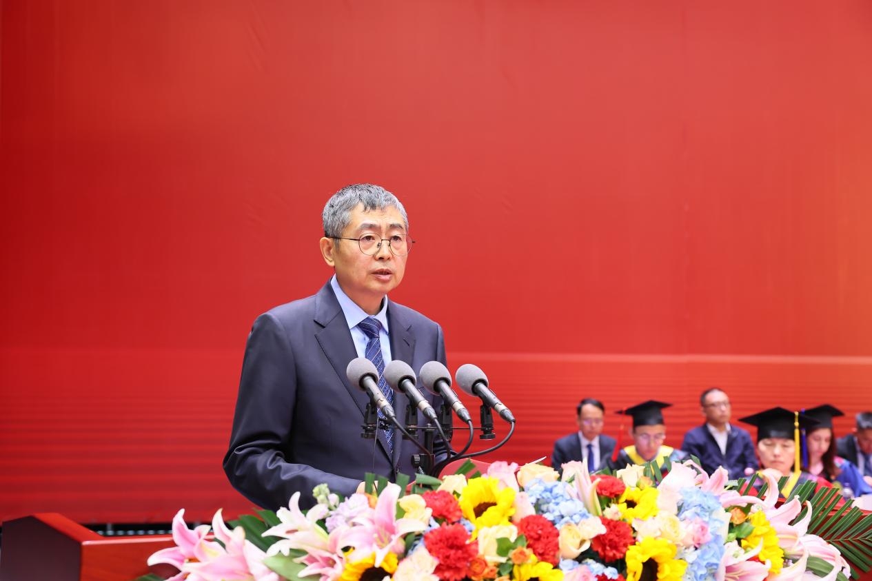 宋保维代表全校师生员工、代表李言荣书记,向同学们表示诚挚的祝贺!向辛勤付出的老师和家人们致以衷心的感谢!他说,几年前同学们满怀赤诚,从五湖四海汇聚于此,在校学习期间体验过研究取得突破时的喜悦、战胜过试验失败时的沮丧,不断在科研活动中锤炼本领、增长才干,取得了沉甸甸的收获,创造了一个个属于你们的高光时刻。作为师长,我由衷地为你们感到骄傲和自豪!当下,国家迫切需要一流的人才队伍,你们是新时代的中国青年,更加自信自强、富于思辨精神,是推进高水平科技自立自强的新鲜血液,也必将是推进中国式现代化的主力军。