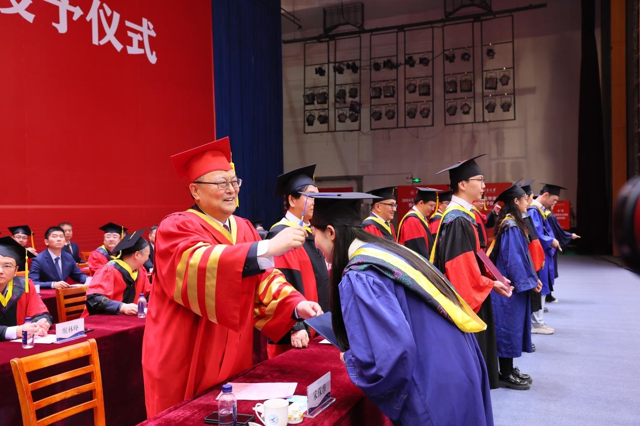 校领导、院士、杰出校友们为毕业生代表拨穗正冠、颁发毕业证书并合影留念。