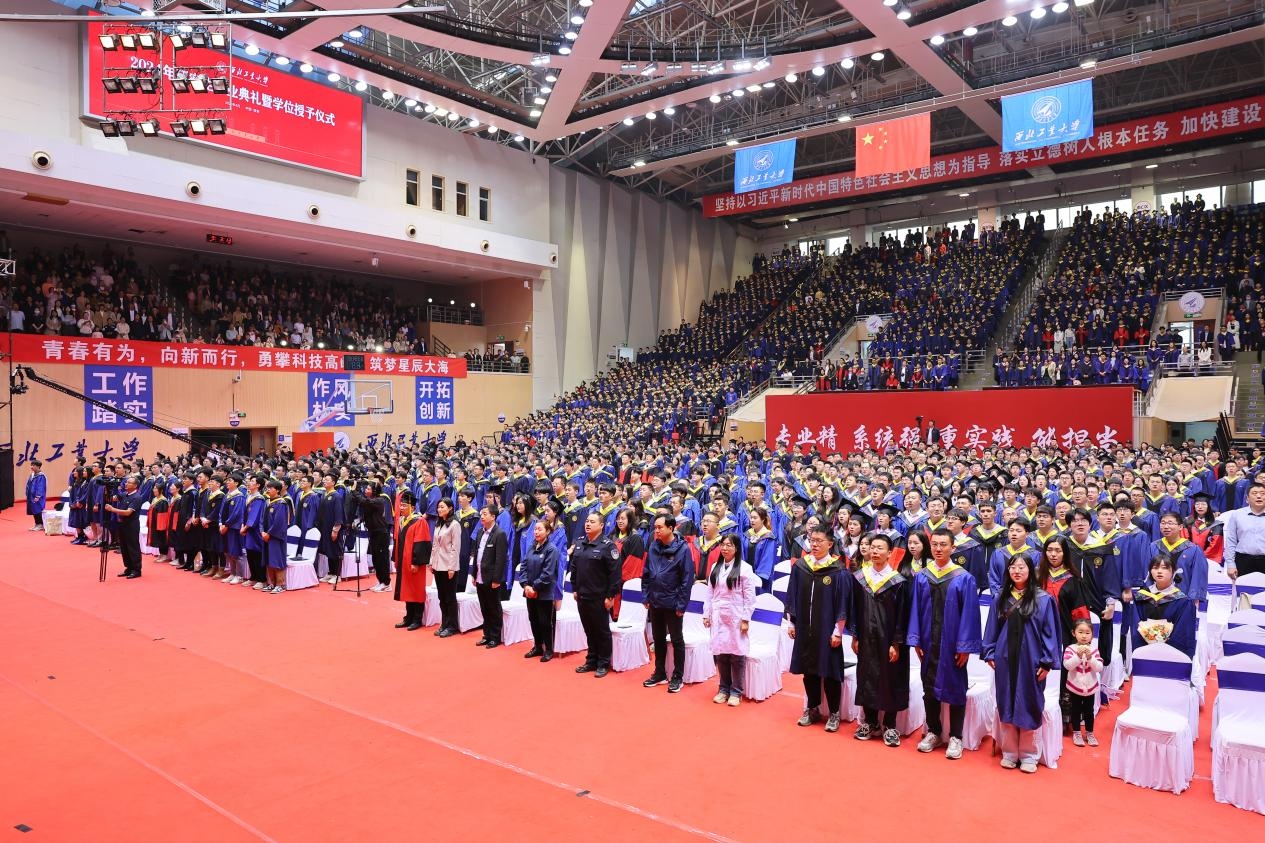 典礼的最后,毕业生们共同唱起《西北工业大学校歌》,雄壮嘹亮,慷慨激昂的合唱声在典礼现场久久回荡,隽永留长。