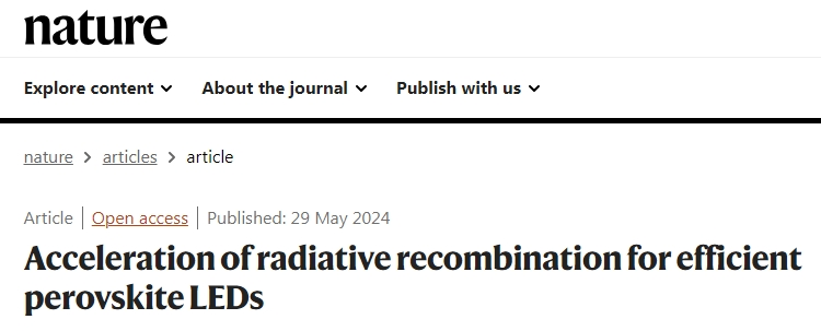 近日,西北工业大学黄维院士、南京工业大学朱琳副教授和常州大学王建浦教授团队在钙钛矿发光二极管(LED)研究领域取得重大突破:利用加快辐射复合速率,显著提高荧光量子效率,使钙钛矿LED外量子效率突破30%大关,接近产业化水平。相关成果以“Acceleration of radiative recombination for efficient perovskite LEDs”为题发表在国际顶尖学术期刊Nature(《自然》)上。