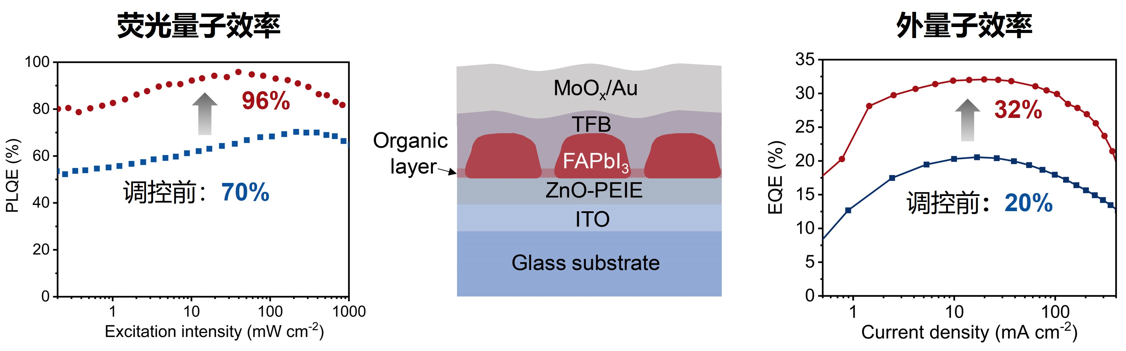 为解决这一世界性难题,该团队另辟蹊径,创造性地提出了一种通过调控晶体生长的方法,以生成辐射复合速率更快的钙钛矿晶相,从而显著提高了荧光量子效率。同时,团队巧妙地运用这一创新性方法成功地保持了三维钙钛矿的亚微米结构,使得器件的光提取效率不受影响,达到了双管齐下的效果。该研究由此实现了96%的荧光量子效率和大于30%的光提取效率,并进一步制备出外量子效率达到32%的高效钙钛矿LED,再次创造了钙钛矿LED发光效率的世界纪录。“我们同样发现,器件在高亮度下仍能保持高效率,即使在100毫安每平方厘米的大电流密度下,外量子效率仍能保持在30%。”朱琳副教授介绍说。
