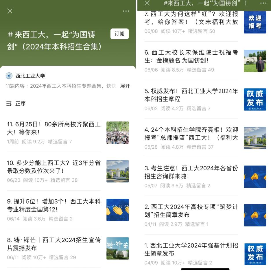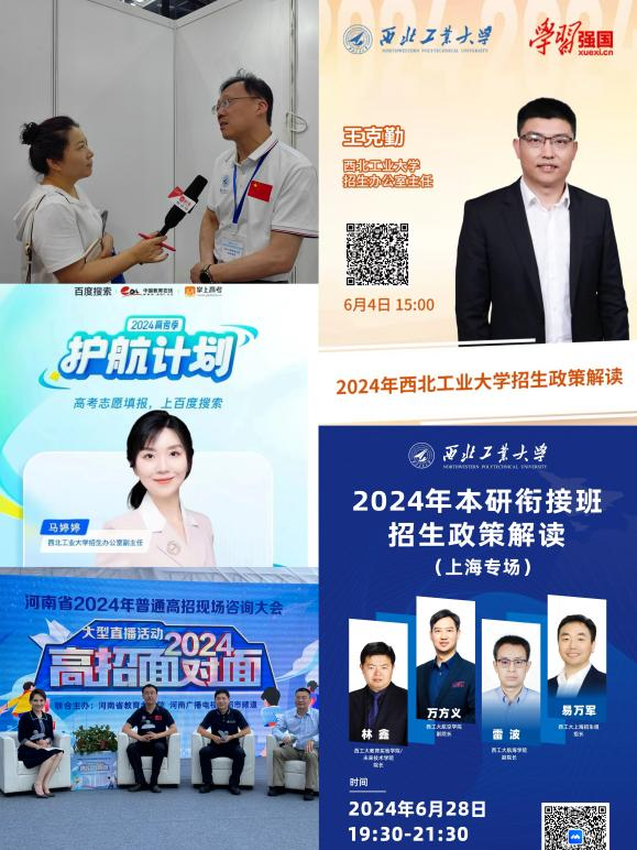 在学校各官方新媒体平台策划推出一系列更加符合融媒体时代碎片化阅读及传播习惯的新媒体作品,把正能量和大流量结合起来,形成招生宣传新的增长点。其中,重磅推出西工大2024年本科招生宣传片《铸·锋芒》,十小时官微浏览量突破10万+。推出的主题推送《西工大为何这样“红”?欢迎报考,给你答案!》,受到社会广泛关注和转发。特别是在“西工大招办”视频号、抖音和B站等平台重点发力,精心打造多个爆款小视频,其中《余承东:我人生最正确的选择,选择了西北工业大学》总浏览量340余万,创历史新高;创新策划制作西工大首个AI形象片《“AI”在西工大,科技创未来》。
