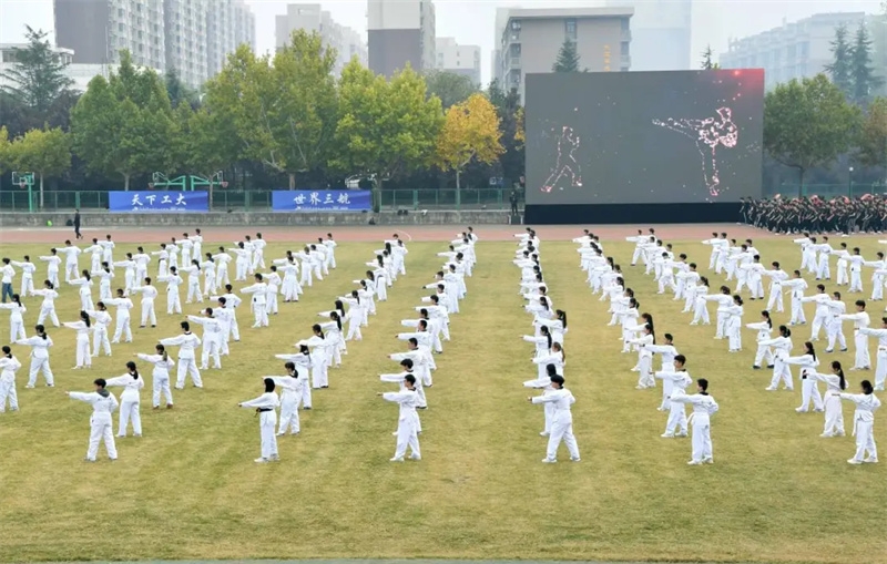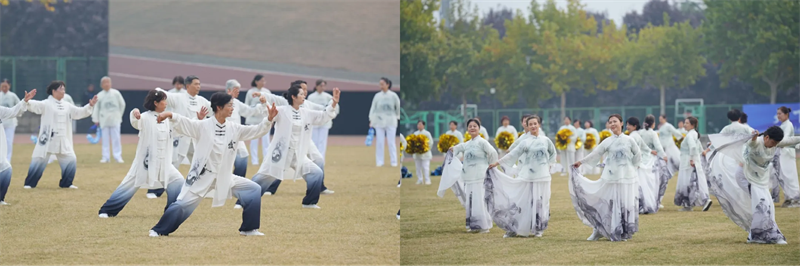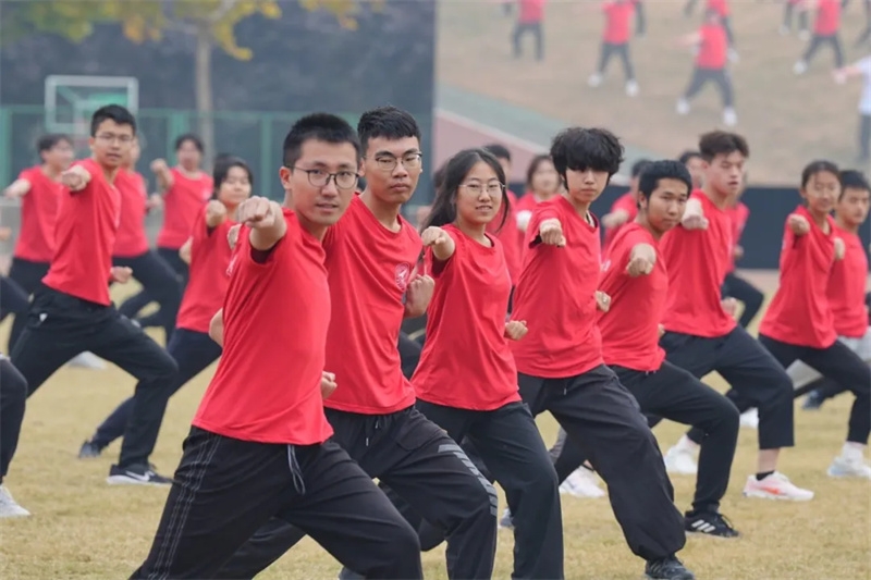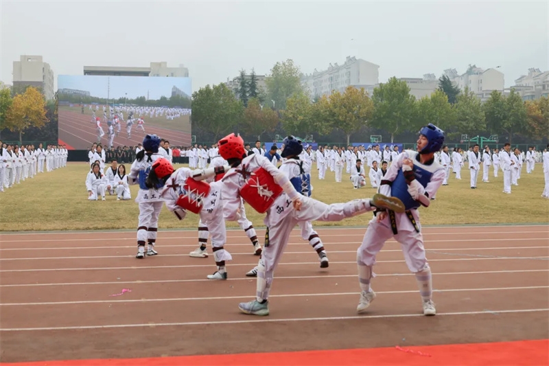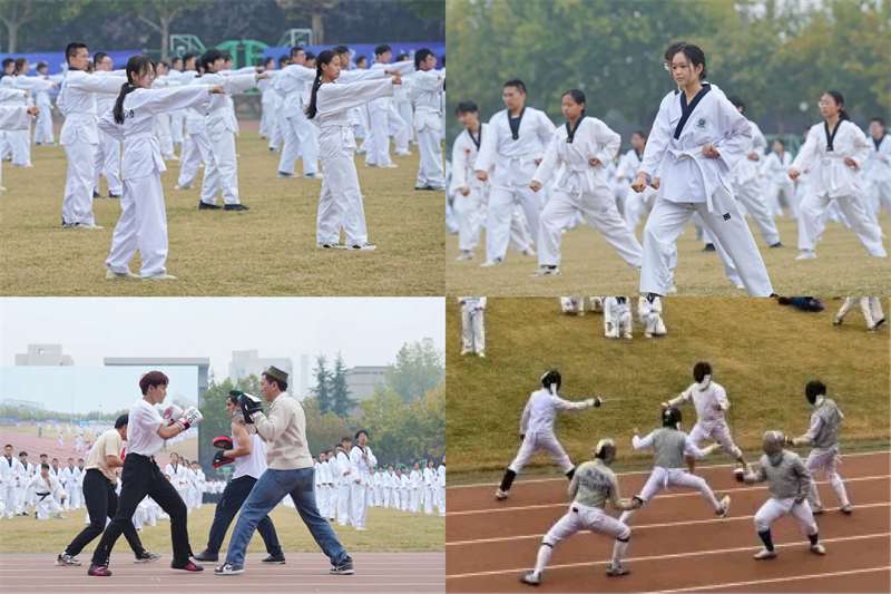 随后,进行了团体操表演,校跆拳道队、击剑队、摔跤队带来了《精忠报国》,将音乐与力量之美巧妙串联,铿锵有力、刚柔相济。