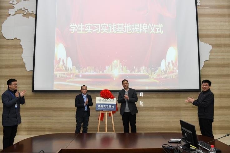 彭亮代表学校教务处介绍了学校实践育人的理念与需求,学校将依托七一六研究所的优势资源把学生实习落到实处,把实习基地做实做强,让学生在实践中提高专业素养。最后,在与会人员的见证下,雷波与戴竟代表双方在合作协议上签字,孙华强与王松岩共同揭牌。