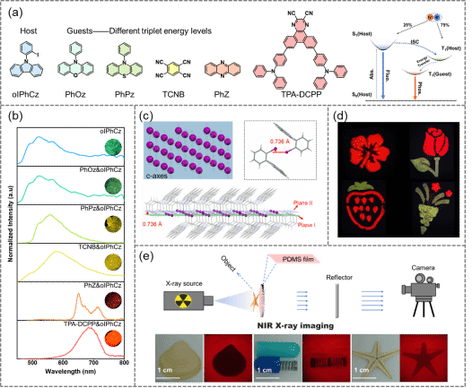 研究表明,主客体掺杂策略可以实现X射线吸收中心和辐射发光中心分离,主体材料吸收X射线通过能量转移实现客体发光,有效的避免的重原子猝灭发光的影响。依据单晶分析和理论计算,主体oIPhCz中重原子的排列以及分子间弱相互作用有效的提升了其X射线的吸收能力。因而基于oIPhCz的掺杂材料实现了高效、可调且稳定性优异的辐射发光。 基于此,这些材料还制备了有机闪烁体薄膜应用于X射线成像。这项工作为下一代有机闪烁体材料的设计、构建及应用提供了新的策略,并促进了其在柔性X射线成像等方面的应用。