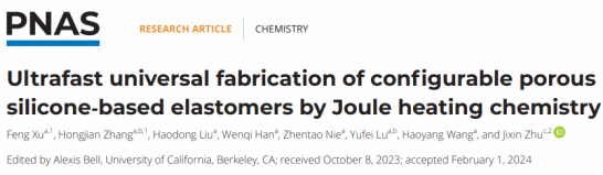 相关研究成果以“Ultrafast universal fabrication of configurable porous silicone-based elastomers by Joule heating chemistry”为题发表在国际顶级期刊PNAS上,本文第一单位为西北工业大学柔性电子研究院,博士生徐峰和张洪健为该论文的共同第一作者,通讯作者为朱纪欣教授。上述工作得到了国家重点研发计划、国家自然科学基金等经费的支持。
