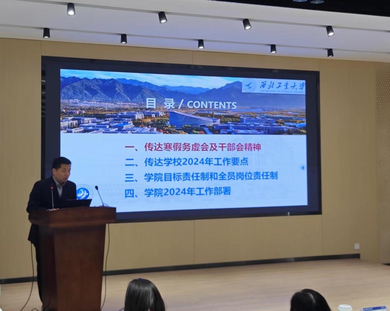王高祖首先宣贯了学校寒假务虚会和新学期干部大会会议精神,带领参会人员学习了宋保维校长题为《统筹推进科技创新与人才队伍建设 加快建设中国特色世界一流大学》的报告、李言荣书记的讲话精神和《西北工业大学2024年工作要点》,随后详细说明了学校关于新一轮聘期教师基本工作量的相关政策,重点介绍了学校的整体工作考虑、基本工作量的计算以及考核和绩效分配等内容,并针对大家提出的问题进行了解答。
