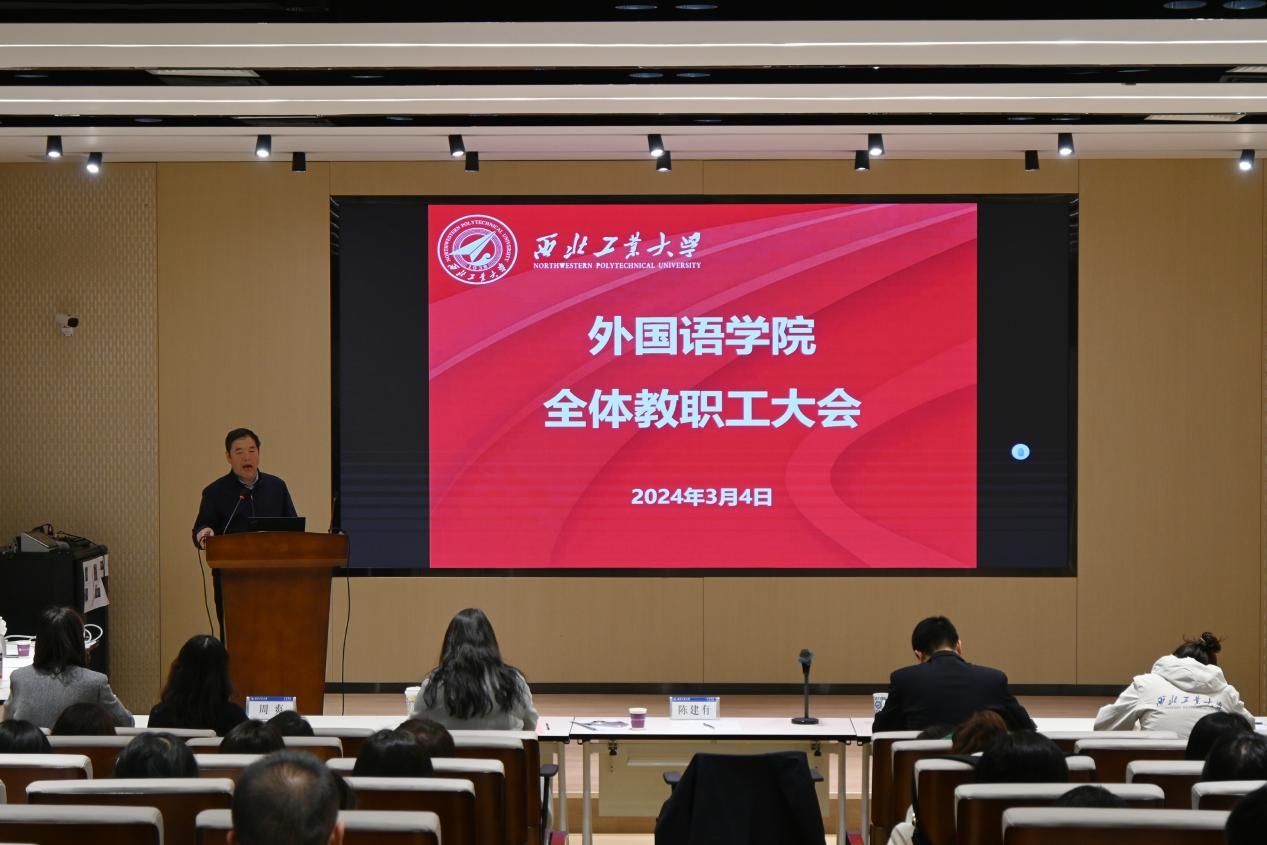 3月4日下午,外国语学院召开全体教职工大会,传达学习学校寒假务虚会、新学期干部会会议精神,详细解读学院目标责任制和新一轮全员岗位责任制教师基本工作量政策要求,贯彻落实全员岗位聘任和学院目标责任制工作。校党委副书记陈建有出席会议,会议由学院党委书记王高祖主持,院长孙瑜、学院领导班子及教职工参加会议。
