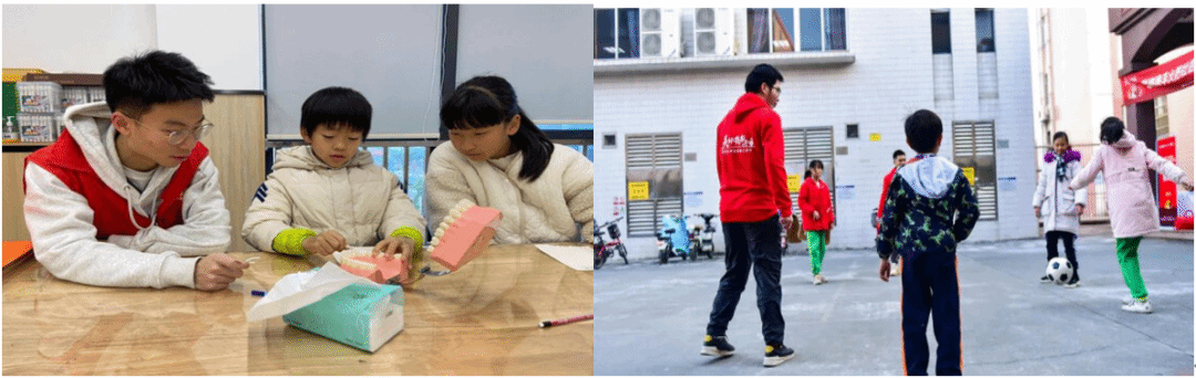 实践队队员与小朋友一起做手工和踢足球