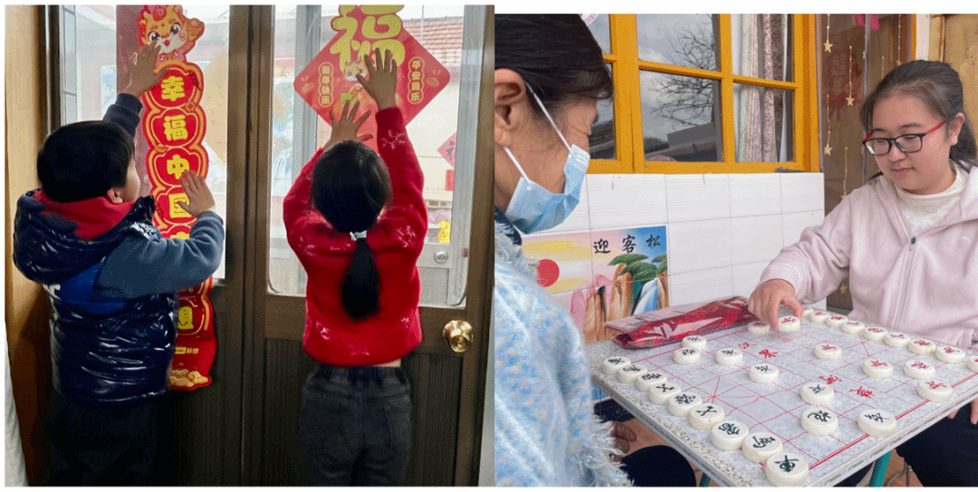 “美好感恩”活动中孩子们贴春联、下象棋