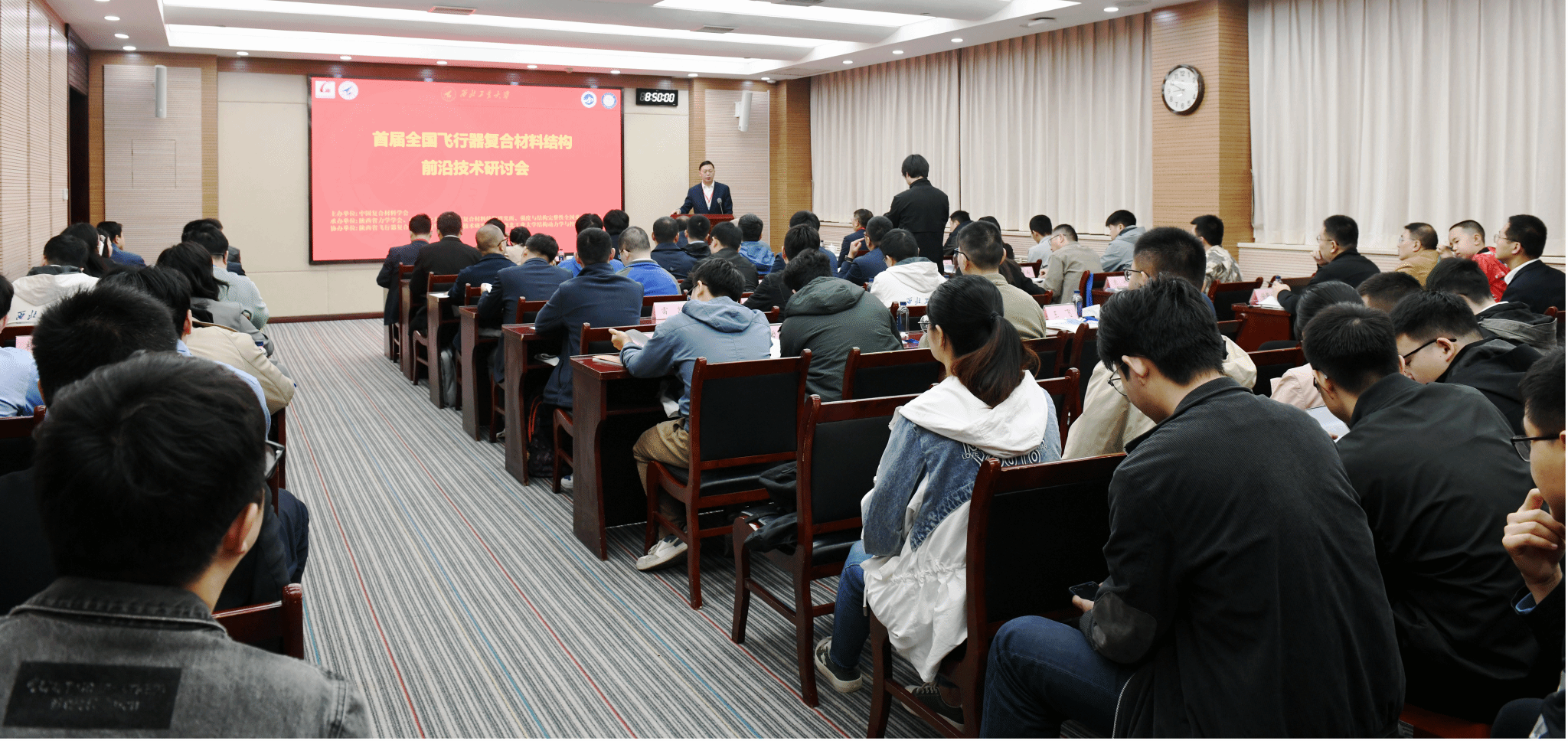 鸭脖官网副校长张开富,中国复合材料学会副秘书长、化学与化工学院院长顾军渭,对外联络办公室主任、校友会教育基金会秘书长杨铭,航空学院院长索涛、党委书记于辉、副院长李斌,陕西省力学学会秘书长、航空结构工程系主任吴振等出席会议。共有来自航空工业601所、一飞院、623所、618所、陕飞公司、中航光电、中航技,中国商飞上飞院、复合材料中心,航天工业一院、二院、四院、六院、十一院,蓝箭航天,兵器工业206所,中国融通60所,长三角先进材料研究院,以及上海交通大学、西安交通大学、北京理工大学、西北工业大学、香港大学等科研院所和高校的110余位知名专家、青年学者和研究生参会。会议由西北工业大学飞行器复合材料结构研究所所长郑锡涛主持。