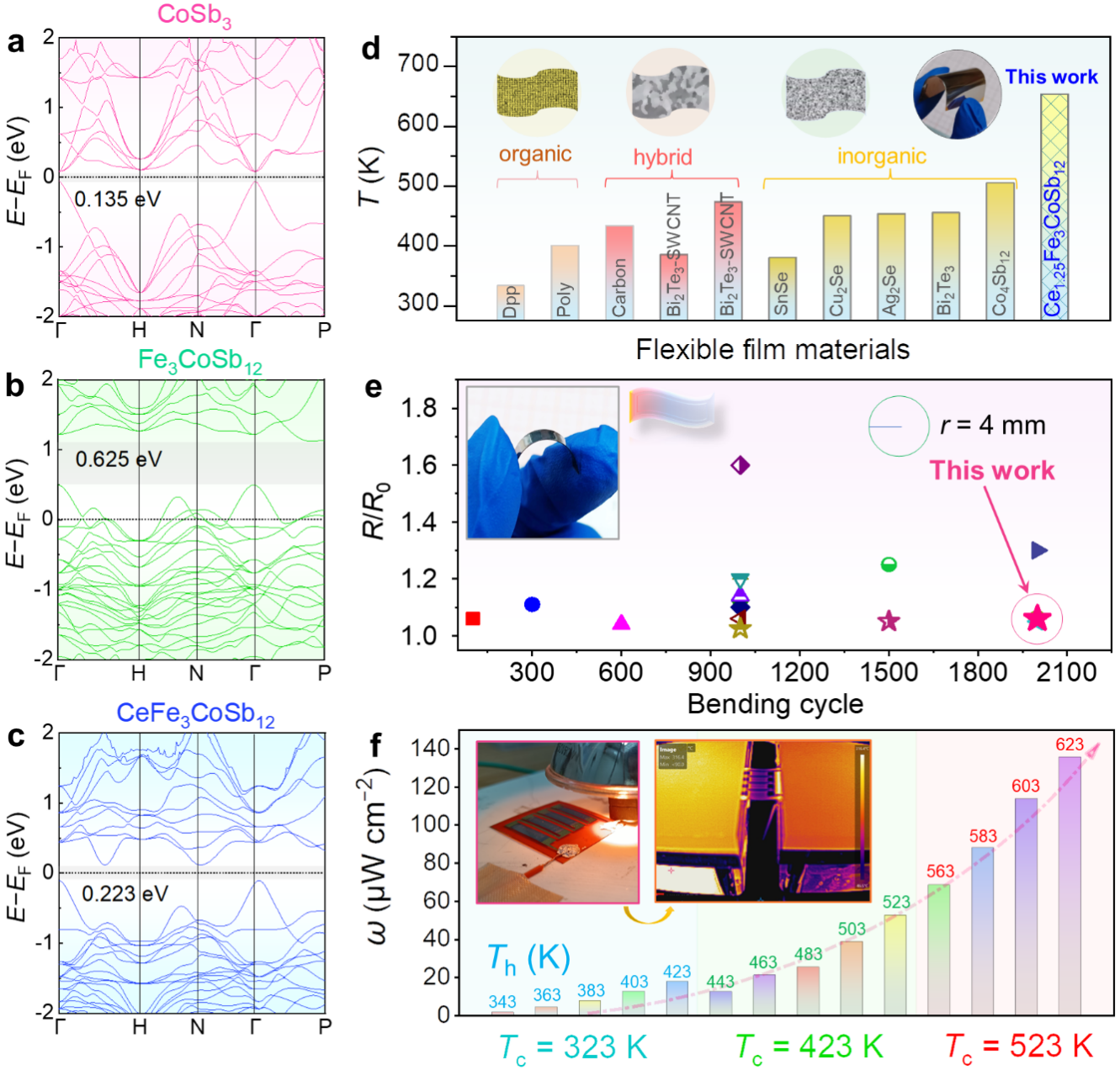 (a)(b)(c)能带结构.(d)柔性薄膜测试温度对比.(e)薄膜柔性测试.(f)柔性器件的输出能力.