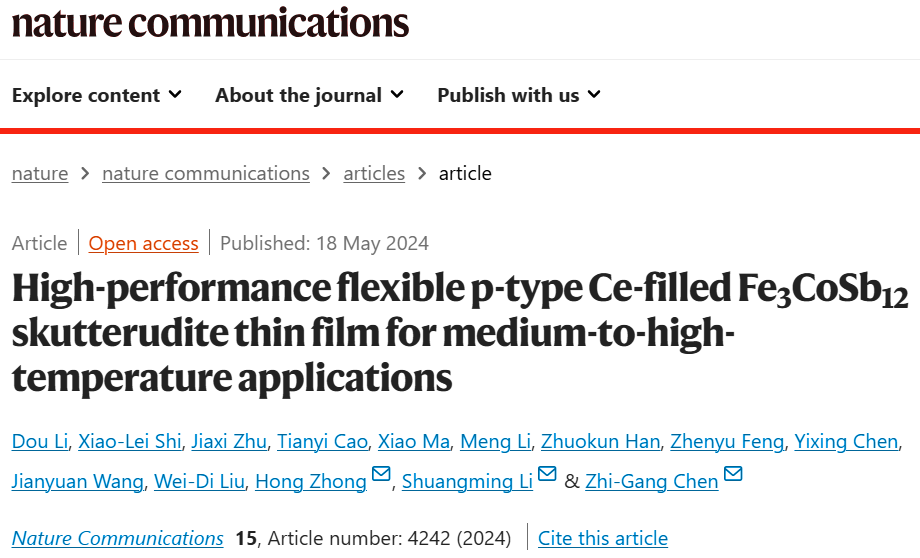 近日,西北工业大学凝固技术国家重点实验室李双明教授团队在中高温p型柔性方钴矿薄膜热电材料研究方面取得突破性进展。成功开发出方钴矿靶材到薄膜合成的技术路线,获得了可用于中高温弯曲热表面余热管理的柔性热电薄膜,表现出良好的温差发电性能,有重要的实用价值。研究成果以“High-performance flexible p-type Ce-filled Fe3CoSb12skutterudite thin film for medium-to-high-temperature applications”为题发表在高水平学术期刊——Nature Communications(《自然·通讯》)上。